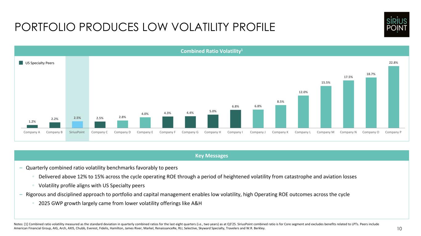 90.1% 89.1% 94.2% 92.2% 91.7% 92.1% 89.2% 90.2% 90.2% 90.5% 91.3% 93.7% 96.2% 95.9% 94.2% 97.5% 97.9% 103.9% 101.6% 101.3% 99.4% 93.9% 93.7% 92.4% 93.0% 92.0% 91.3% 92.2% 91.1% 91.1% 91.7% Peer Average SiriusPoint Core (ex. LPT Benefit) Q1 22 Q2 22 Q3 22 Q4 22 Q1 23 Q2 23 Q3 23 Q4 23 Q1 24 Q2 24 Q3 24 Q4 24 Q1 25 Q2 25 Q3 25 Q4 25 9 EXECUTING ON OUR AMBITION OF BEST-IN-CLASS UNDERWRITING Notes: [1] Peer average includes American Financial Group, AIG, Arch, AXIS, Chubb, Everest, Fidelis, Hamilton, James River, Markel, RenaissanceRe, RLI, Selective, Skyward Specialty, Travelers and W.R. Berkley. [2] Q4'25 peer average not shown as various peers are still to report. Trailing Twelve Months Combined Ratio 1 Key Messages – Portfolio actions created a 12.2 point improvement in SiriusPoint's trailing twelve month combined ratio compared to Q3'22 – Combined ratio volatility significantly reduced as of Q3'23, despite an increase in peer volatility, with continued improvement from targeted actions – Starting Q4'24, SiriusPoint has achieved a trailing twelve month Core combined ratio that has outperformed the peer average 2