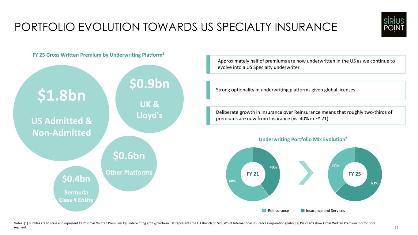 Combined Ratio Volatility1 10 PORTFOLIO PRODUCES LOW VOLATILITY PROFILE Notes: [1] Combined ratio volatility measured as the standard deviation in quarterly combined ratios for the last eight quarters (i.e., two years) as at Q3'25. SiriusPoint combined ratio is for Core segment and excludes benefits related to LPTs. Peers include American Financial Group, AIG, Arch, AXIS, Chubb, Everest, Fidelis, Hamilton, James River, Markel, RenaissanceRe, RLI, Selective, Skyward Specialty, Travelers and W.R. Berkley. 1.2% 2.2% 2.5% 2.5% 2.8% 4.0% 4.3% 4.4% 5.0% 6.8% 6.8% 8.5% 12.0% 15.5% 17.5% 18.7% 22.8% Company A Company B SiriusPoint Company C Company D Company E Company F Company G Company H Company I Company J Company K Company L Company M Company N Company O Company P Key Messages – Quarterly combined ratio volatility benchmarks favorably to peers ◦ Delivered above 12% to 15% across the cycle operating ROE through a period of heightened volatility from catastrophe and aviation losses ◦ Volatility profile aligns with US Specialty peers – Rigorous and disciplined approach to portfolio and capital management enables low volatility, high Operating ROE outcomes across the cycle ◦ 2025 GWP growth largely came from lower volatility offerings like A&H US Specialty Peers