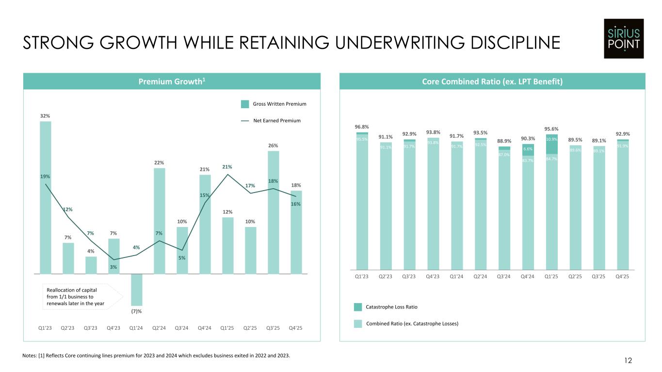 11 PORTFOLIO EVOLUTION TOWARDS US SPECIALTY INSURANCE Notes: [1] Bubbles are to scale and represent FY 25 Gross Written Premiums by underwriting entity/platform. UK represents the UK Branch on SiriusPoint International Insurance Corporation (publ). [2] Pie charts show Gross Written Premium mix for Core segment. $1.8bn US Admitted & Non-Admitted $0.4bn Bermuda Class 4 Entity $0.9bn UK & Lloyd's $0.6bn Other Platforms FY 25 Gross Written Premium by Underwriting Platform1 40% 60% 63% 37% Reinsurance Insurance and Services Underwriting Portfolio Mix Evolution2 Strong optionality in underwriting platforms given global licenses Deliberate growth in Insurance over Reinsurance means that roughly two-thirds of premiums are now from Insurance (vs. 40% in FY 21) Approximately half of premiums are now underwritten in the US as we continue to evolve into a US Specialty underwriter FY 21 FY 25