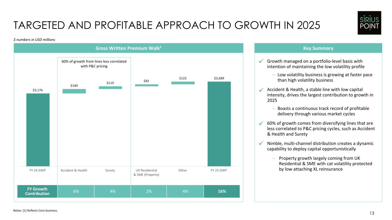 12 STRONG GROWTH WHILE RETAINING UNDERWRITING DISCIPLINE Notes: [1] Reflects Core continuing lines premium for 2023 and 2024 which excludes business exited in 2022 and 2023. 32% 7% 4% 7% (7)% 22% 10% 21% 12% 10% 26% 18% 19% 12% 7% 3% 4% 7% 5% 15% 21% 17% 18% 16% Q1'23 Q2'23 Q3'23 Q4'23 Q1'24 Q2'24 Q3'24 Q4'24 Q1'25 Q2'25 Q3'25 Q4'25 Core Combined Ratio (ex. LPT Benefit)Premium Growth1 Reallocation of capital from 1/1 business to renewals later in the year 95.5% 91.1% 91.7% 93.8% 91.7% 92.5% 87.0% 83.7% 84.7% 89.6% 89.1% 91.9% 6.6% 10.9% 96.8% 91.1% 92.9% 93.8% 91.7% 93.5% 88.9% 90.3% 95.6% 89.5% 89.1% 92.9% Q1'23 Q2'23 Q3'23 Q4'23 Q1'24 Q2'24 Q3'24 Q4'24 Q1'25 Q2'25 Q3'25 Q4'25 Catastrophe Loss Ratio Combined Ratio (ex. Catastrophe Losses) Gross Written Premium Net Earned Premium