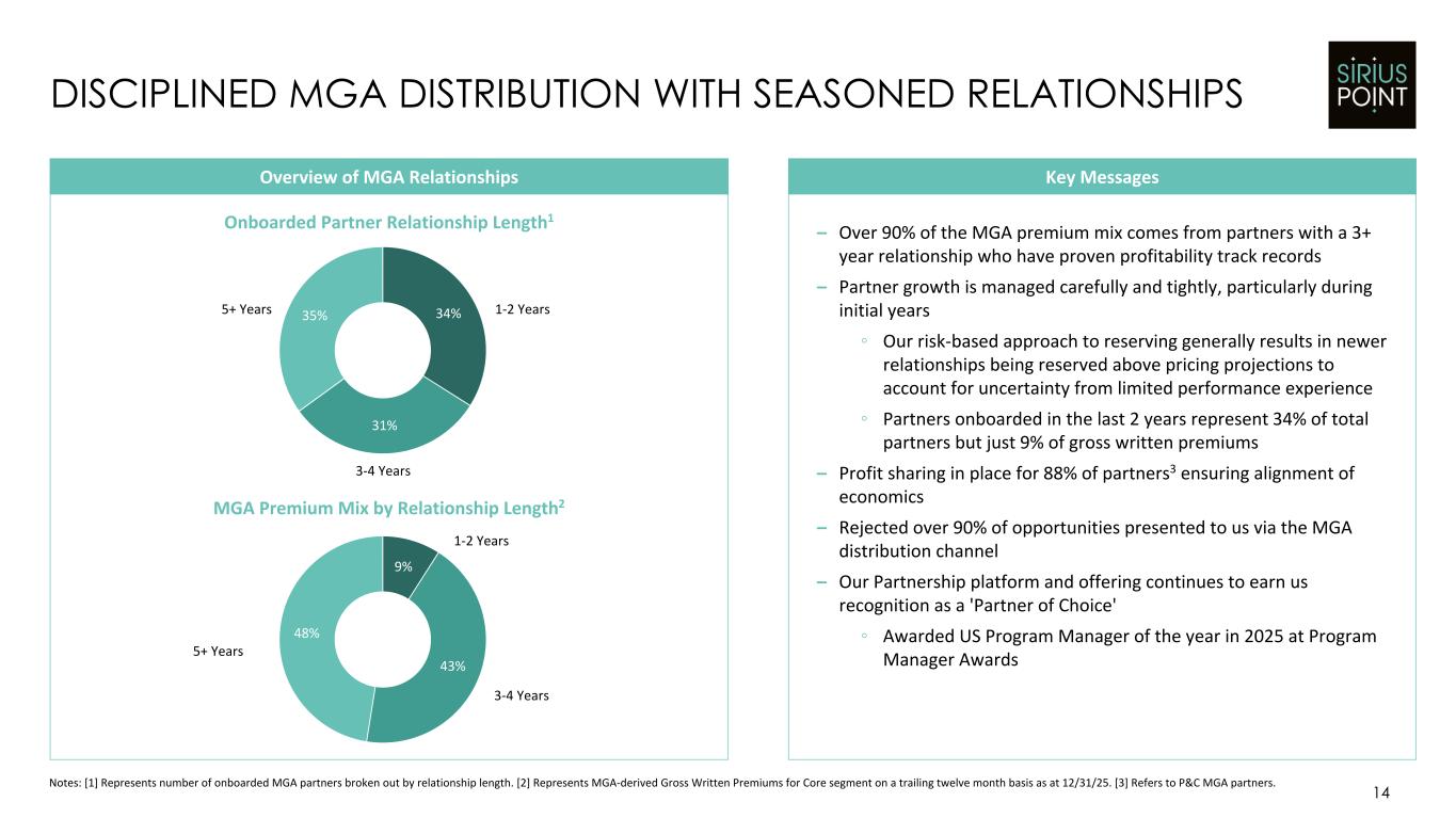 60% of growth from lines less correlated with P&C pricing 13 TARGETED AND PROFITABLE APPROACH TO GROWTH IN 2025 Notes: [1] Reflects Core business. Key SummaryGross Written Premium Walk1 $3,176 $189 $119 $82 $122 $3,689 FY 24 GWP Accident & Health Surety UK Residential & SME (Property) Other FY 25 GWP Growth managed on a portfolio-level basis with intention of maintaining the low volatility profile Low volatility business is growing at faster pace than high volatility business Accident & Health, a stable line with low capital intensity, drives the largest contribution to growth in 2025 Boasts a continuous track record of profitable delivery through various market cycles 60% of growth comes from diversifying lines that are less correlated to P&C pricing cycles, such as Accident & Health and Surety Nimble, multi-channel distribution creates a dynamic capability to deploy capital opportunistically Property growth largely coming from UK Residential & SME with cat volatility protected by low attaching XL reinsurance $ numbers in USD millions – – – FY Growth Contribution 6% 4% 2% 4% 16%
