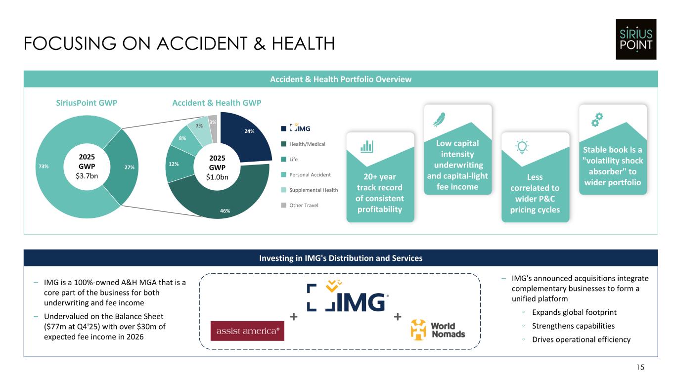 9% 43% 48% 14 DISCIPLINED MGA DISTRIBUTION WITH SEASONED RELATIONSHIPS Overview of MGA Relationships Key Messages 1-2 Years 5+ Years 3-4 Years – Over 90% of the MGA premium mix comes from partners with a 3+ year relationship who have proven profitability track records – Partner growth is managed carefully and tightly, particularly during initial years ◦ Our risk-based approach to reserving generally results in newer relationships being reserved above pricing projections to account for uncertainty from limited performance experience ◦ Partners onboarded in the last 2 years represent 34% of total partners but just 9% of gross written premiums – Profit sharing in place for 88% of partners3 ensuring alignment of economics – Rejected over 90% of opportunities presented to us via the MGA distribution channel – Our Partnership platform and offering continues to earn us recognition as a 'Partner of Choice' ◦ Awarded US Program Manager of the year in 2025 at Program Manager Awards Notes: [1] Represents number of onboarded MGA partners broken out by relationship length. [2] Represents MGA-derived Gross Written Premiums for Core segment on a trailing twelve month basis as at 12/31/25. [3] Refers to P&C MGA partners. 34% 31% 35% Onboarded Partner Relationship Length1 1-2 Years 5+ Years 3-4 Years MGA Premium Mix by Relationship Length2