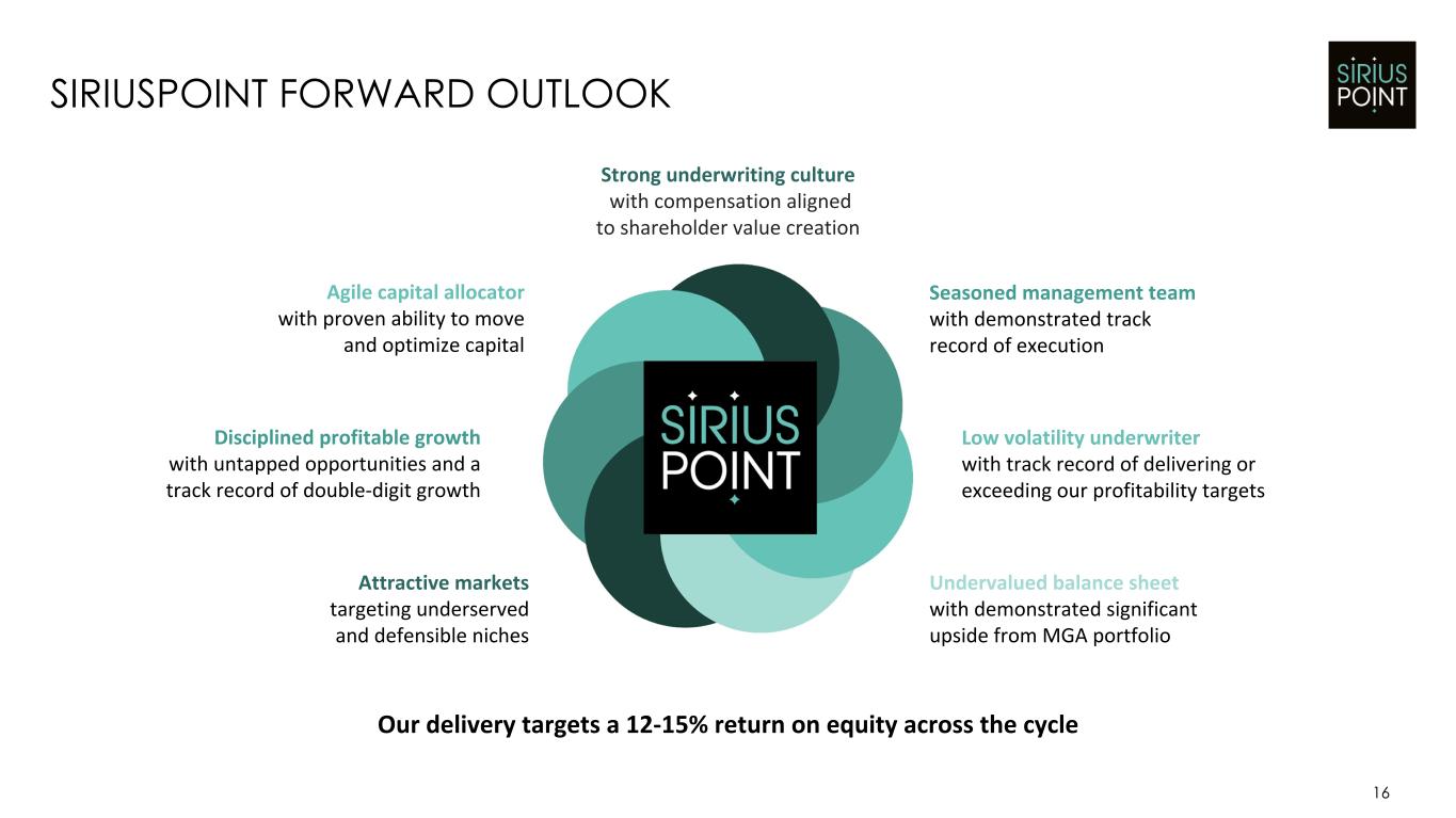 24% 46% 12% 8% 7% 3% IMG Health/Medical Life Personal Accident Supplemental Health Other Travel 15 FOCUSING ON ACCIDENT & HEALTH Investing in IMG's Distribution and Services Accident & Health Portfolio Overview – IMG is a 100%-owned A&H MGA that is a core part of the business for both underwriting and fee income – Undervalued on the Balance Sheet ($77m at Q4'25) with over $30m of expected fee income in 2026 SiriusPoint GWP Accident & Health GWP 2025 GWP $3.7bn 2025 GWP $1.0bn 20+ year track record of consistent profitability Stable book is a "volatility shock absorber" to wider portfolio Less correlated to wider P&C pricing cycles Low capital intensity underwriting and capital-light fee income + + – IMG's announced acquisitions integrate complementary businesses to form a unified platform ◦ Expands global footprint ◦ Strengthens capabilities ◦ Drives operational efficiency 27%73%