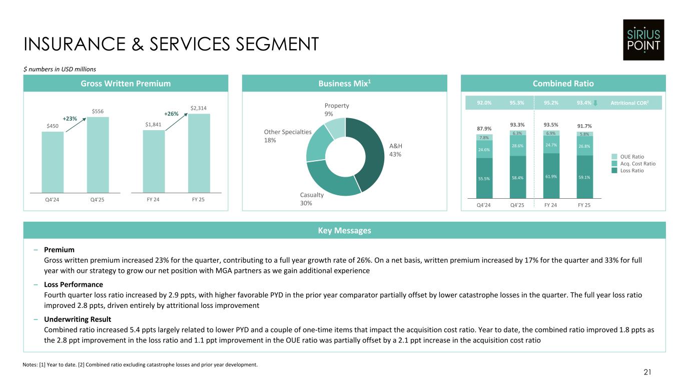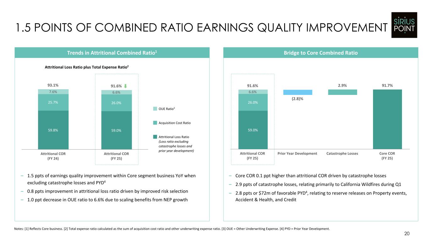 Financial Highlights $ numbers in USD millions FY 24 FY 25 Gross Written Premium $3,176 $3,689 Net Written Premium $2,341 $2,778 COR (%) 91.0% 91.7% UW Income $200 $214 Net Services Fee Income $47 $42 Total Investment Result2 $225 $272 Operating Net Income3 $304 $310 Operating Earnings Per Share4 $1.71 $2.55 Common Shareholders' Equity5 $1,737 $2,270 Diluted Book Value Per Share (ex. AOCI) $14.64 $18.10 FULL YEAR 2025 FINANCIAL RESULTS 19 Notes: [1] Reflects Core segment. [2] Total investment result calculated as the sum of net realized and unrealized investment gains (losses), net realized and unrealized investment gains (losses) from related party investment funds and net investment income. [3] Operating Net Income represents a non-GAAP measure. See Appendix 1 on slide 29 for a reconciliation. [4] Operating Diluted Earnings Per Share is a non-GAAP measure. See Appendix 2 on slide 30 for a reconciliation. [5] Common shareholders’ equity attributable to SiriusPoint common shareholders at end of period. [6] As shown on slide 20. [7] Excluded from operating net income. – GWP1 up 16%, with NWP1 increasing by 19% and NEP1 up 18% – UW Income up 7% with stable 91.7% COR1 ◦ Quality of earnings improvement with attritional COR decreasing 1.5 ppts YoY6 – Diluted EPS of $3.64, or $2.55 on an operating basis (up 49% YoY) – Total net services fee income1 of $42m – Strong Investment result following asset reduction from CM Bermuda buyback ◦ NII of $275m in line with full year guidance ($265m to $275m) – Other notable pre-tax items impacting FY 25 income: ◦ $222m gain from Armada sale closing7 ◦ $80m interest expense of which $31m7 relates to LPTs ◦ $25m of foreign exchange losses7 – Common shareholders' equity5 increased 31% to $2.3bn – $3.46 increase in diluted book value per share (ex. AOCI) Key Comments CO RE S EG M EN T