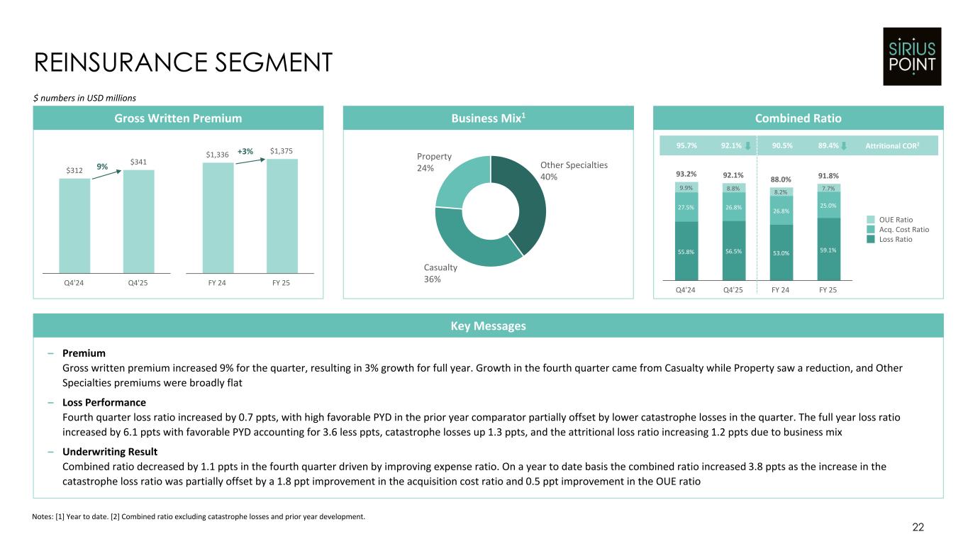 Notes: [1] Year to date. [2] Combined ratio excluding catastrophe losses and prior year development. $450 $556 Q4'24 Q4'25 $1,841 $2,314 FY 24 FY 25 21 INSURANCE & SERVICES SEGMENT Gross Written Premium Combined Ratio Key Messages 55.5% 58.4% 61.9% 59.1% 24.6% 28.6% 24.7% 26.8% 7.8% 6.3% 6.9% 5.8% 87.9% 93.3% 93.5% 91.7% OUE Ratio Acq. Cost Ratio Loss Ratio Q4'24 Q4'25 FY 24 FY 25 Business Mix1 A&H 43% Casualty 30% Other Specialties 18% Property 9% +23% – Premium Gross written premium increased 23% for the quarter, contributing to a full year growth rate of 26%. On a net basis, written premium increased by 17% for the quarter and 33% for full year with our strategy to grow our net position with MGA partners as we gain additional experience – Loss Performance Fourth quarter loss ratio increased by 2.9 ppts, with higher favorable PYD in the prior year comparator partially offset by lower catastrophe losses in the quarter. The full year loss ratio improved 2.8 ppts, driven entirely by attritional loss improvement – Underwriting Result Combined ratio increased 5.4 ppts largely related to lower PYD and a couple of one-time items that impact the acquisition cost ratio. Year to date, the combined ratio improved 1.8 ppts as the 2.8 ppt improvement in the loss ratio and 1.1 ppt improvement in the OUE ratio was partially offset by a 2.1 ppt increase in the acquisition cost ratio Attritional COR292.0% 93.4% +26% 95.3% 95.2% $ numbers in USD millions