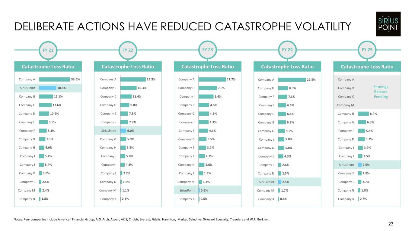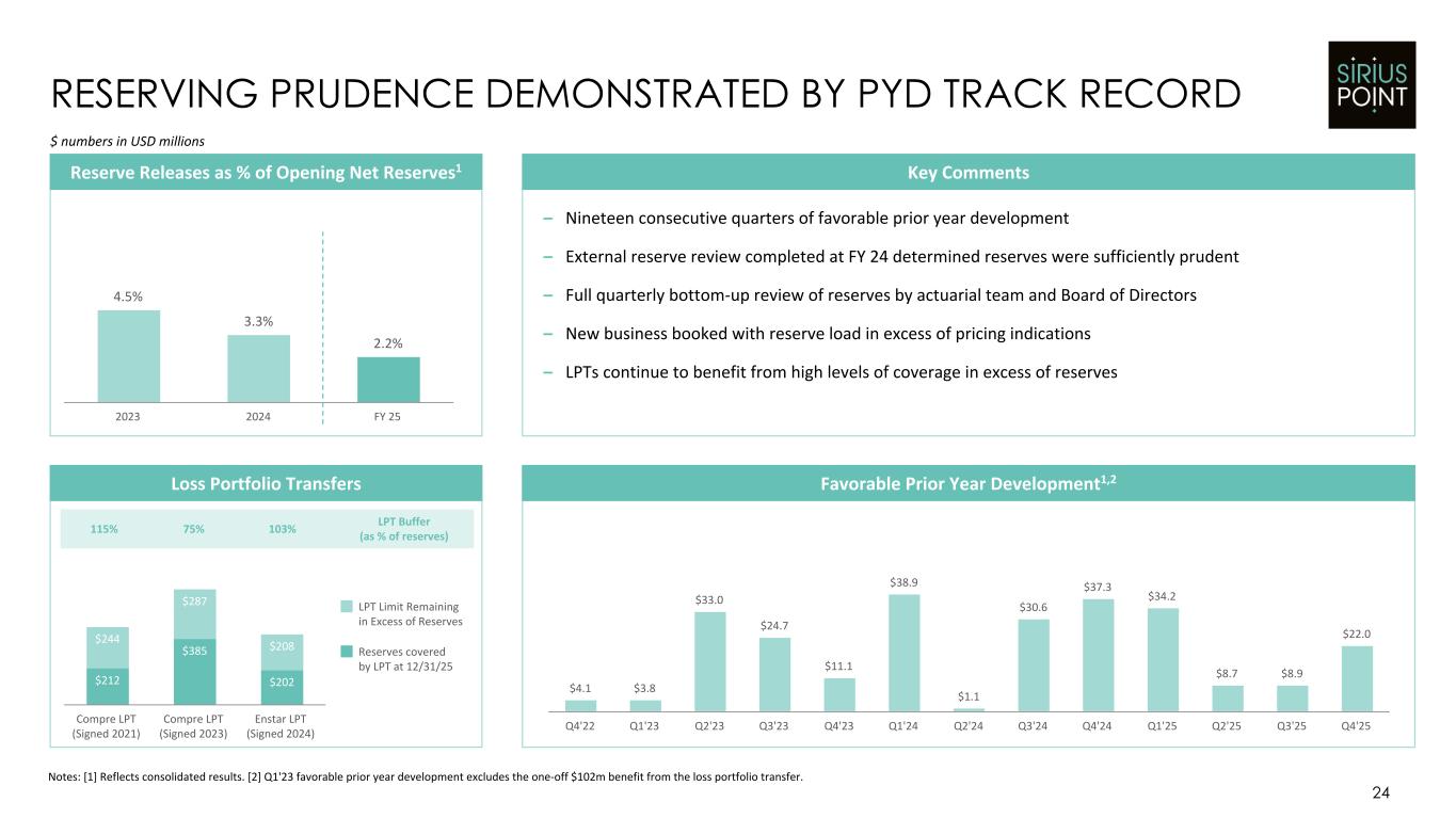 11.7% 7.9% 6.4% 4.6% 4.5% 4.3% 4.1% 3.5% 3.2% 2.7% 2.6% 1.9% 1.4% 0.6% 0.5% Company A Company H Company I Company C Company G Company J Company F Company D Company B Company E Company N Company L Company M SiriusPoint Company K 8.4% 6.3% 5.5% 5.3% 3.9% 3.5% 2.9% 2.8% 2.7% 1.8% 0.7% Company A Company B Company C Company M Company H Company G Company F Company D Company J Company I SiriusPoint Company E Company L Company N Company K 22.5% 8.0% 7.3% 6.5% 6.5% 6.3% 5.5% 5.0% 5.0% 4.3% 2.6% 2.5% 2.5% 1.7% 0.8% Company A Company H Company F Company I Company C Company B Company G Company J Company D Company E Company L Company N SiriusPoint Company M Company K 25.3% 16.3% 11.4% 9.0% 7.8% 7.8% 6.0% 5.9% 5.5% 5.0% 4.3% 2.2% 1.6% 1.1% 0.6% Company A Company B Company C Company D Company E Company F SiriusPoint Company G Company H Company J Company I Company L Company N Company M Company K 23 DELIBERATE ACTIONS HAVE REDUCED CATASTROPHE VOLATILITY FY 21 Catastrophe Loss Ratio FY 23 Catastrophe Loss Ratio FY 24 FY 25 Notes: Peer companies include American Financial Group, AIG, Arch, Aspen, AXIS, Chubb, Everest, Fidelis, Hamilton, Markel, Selective, Skyward Specialty, Travelers and W.R. Berkley. Catastrophe Loss Ratio Earnings Release Pending 33.6% 18.8% 15.1% 13.6% 10.9% 9.5% 8.3% 7.1% 6.0% 5.4% 5.4% 3.0% 2.5% 2.4% 1.8% Company A SiriusPoint Company B Company C Company D Company E Company F Company G Company H Company I Company J Company K Company L Company M Company N Do this as LTM from Q1? Catastrophe Loss Ratio FY 22 Catastrophe Loss Ratio