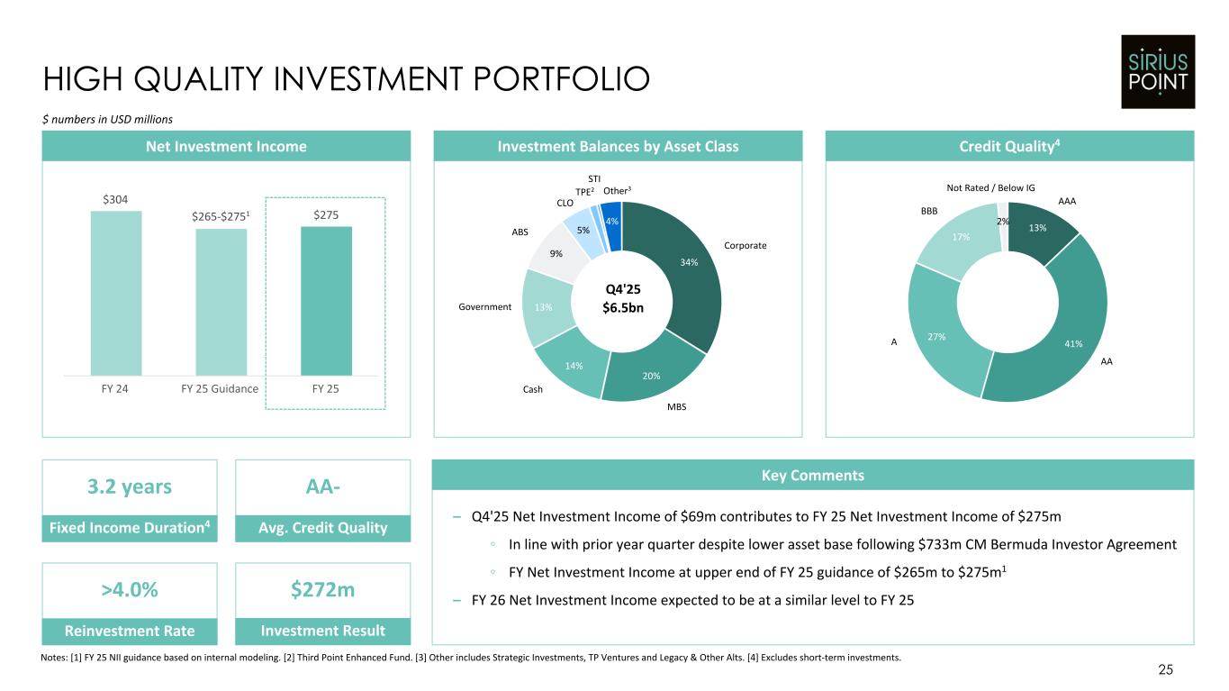 24 RESERVING PRUDENCE DEMONSTRATED BY PYD TRACK RECORD Notes: [1] Reflects consolidated results. [2] Q1'23 favorable prior year development excludes the one-off $102m benefit from the loss portfolio transfer. Favorable Prior Year Development1,2 $4.1 $3.8 $33.0 $24.7 $11.1 $38.9 $1.1 $30.6 $37.3 $34.2 $8.7 $8.9 $22.0 Q4'22 Q1'23 Q2'23 Q3'23 Q4'23 Q1'24 Q2'24 Q3'24 Q4'24 Q1'25 Q2'25 Q3'25 Q4'25 4.5% 3.3% 2.2% 2023 2024 FY 25 Reserve Releases as % of Opening Net Reserves1 $ numbers in USD millions – Nineteen consecutive quarters of favorable prior year development – External reserve review completed at FY 24 determined reserves were sufficiently prudent – Full quarterly bottom-up review of reserves by actuarial team and Board of Directors – New business booked with reserve load in excess of pricing indications – LPTs continue to benefit from high levels of coverage in excess of reserves Key Comments $212 $385 $202 $244 $287 $208 LPT Limit Remaining in Excess of Reserves Reserves covered by LPT at 12/31/25 Compre LPT (Signed 2021) Compre LPT (Signed 2023) Enstar LPT (Signed 2024) Loss Portfolio Transfers LPT Buffer (as % of reserves) 115% 75% 103%