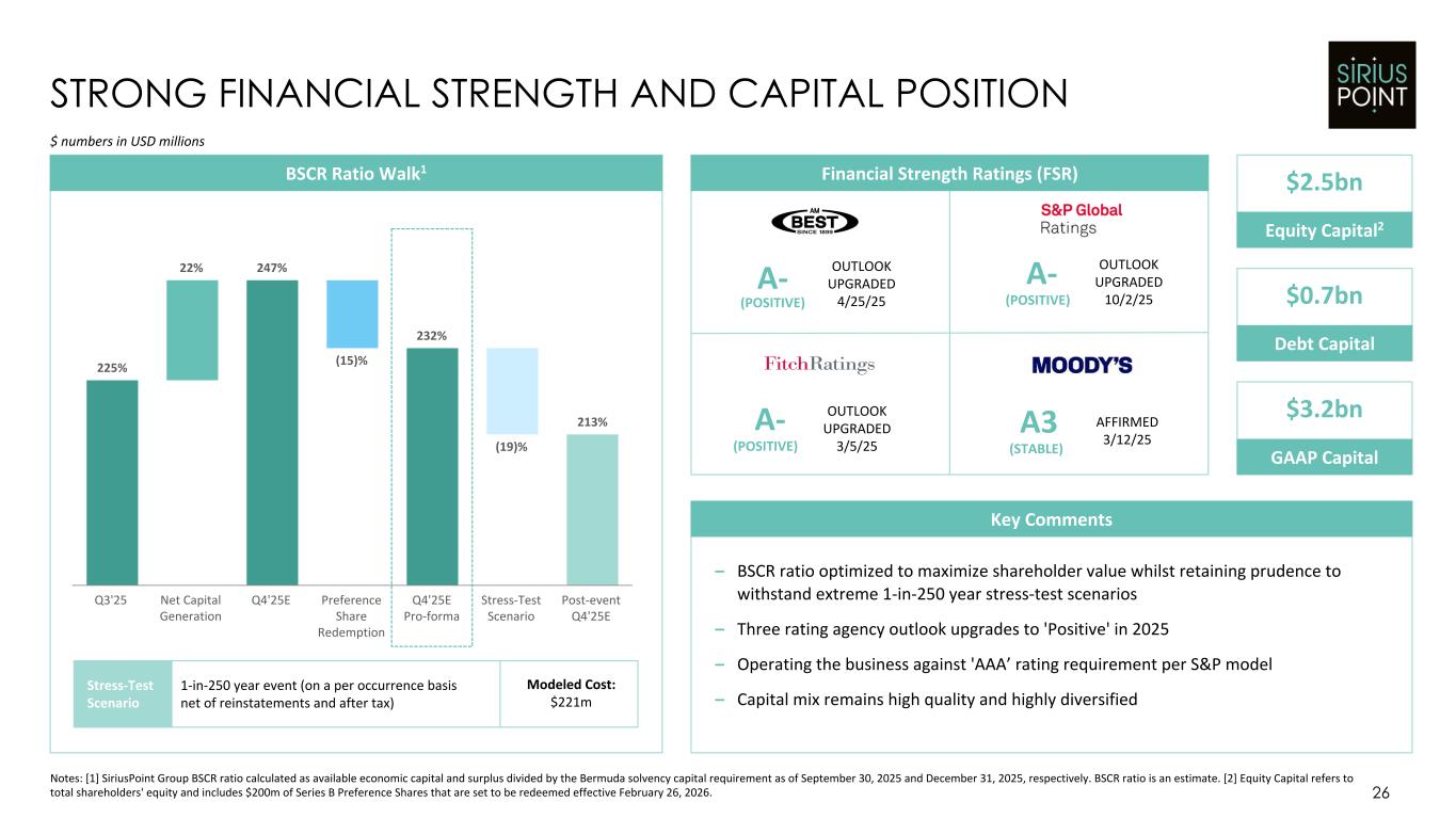 $304 $275 FY 24 FY 25 Guidance FY 25 13% 41% 27% 17% 2% HIGH QUALITY INVESTMENT PORTFOLIO 25 $ numbers in USD millions Key Comments Notes: [1] FY 25 NII guidance based on internal modeling. [2] Third Point Enhanced Fund. [3] Other includes Strategic Investments, TP Ventures and Legacy & Other Alts. [4] Excludes short-term investments. $265-$2751 Net Investment Income – Q4'25 Net Investment Income of $69m contributes to FY 25 Net Investment Income of $275m ◦ In line with prior year quarter despite lower asset base following $733m CM Bermuda Investor Agreement ◦ FY Net Investment Income at upper end of FY 25 guidance of $265m to $275m1 – FY 26 Net Investment Income expected to be at a similar level to FY 25 Credit Quality4Investment Balances by Asset Class 34% 20% 14% 13% 9% 5% 4% AAA AA A BBB Not Rated / Below IG STI Corporate Other3 Fixed Income Duration4 Avg. Credit Quality 3.2 years AA- Reinvestment Rate >4.0% Investment Result $272m MBS Cash Government ABS CLO TPE2 Q4'25 $6.5bn