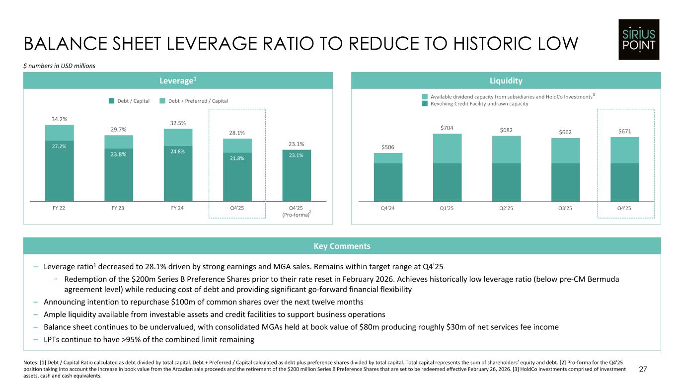 225% 22% 247% (15)% 232% (19)% 213% Q3'25 Net Capital Generation Q4'25E Preference Share Redemption Q4'25E Pro-forma Stress-Test Scenario Post-event Q4'25E 26 Notes: [1] SiriusPoint Group BSCR ratio calculated as available economic capital and surplus divided by the Bermuda solvency capital requirement as of September 30, 2025 and December 31, 2025, respectively. BSCR ratio is an estimate. [2] Equity Capital refers to total shareholders' equity and includes $200m of Series B Preference Shares that are set to be redeemed effective February 26, 2026. STRONG FINANCIAL STRENGTH AND CAPITAL POSITION – BSCR ratio optimized to maximize shareholder value whilst retaining prudence to withstand extreme 1-in-250 year stress-test scenarios – Three rating agency outlook upgrades to 'Positive' in 2025 – Operating the business against 'AAA’ rating requirement per S&P model – Capital mix remains high quality and highly diversified BSCR Ratio Walk1 $ numbers in USD millions Stress-Test Scenario 1-in-250 year event (on a per occurrence basis net of reinstatements and after tax) Modeled Cost: $221m Financial Strength Ratings (FSR) Key Comments Equity Capital2 GAAP Capital Debt Capital $2.5bn $0.7bn $3.2bn OUTLOOK UPGRADED 4/25/25 AFFIRMED 3/12/25 OUTLOOK UPGRADED 3/5/25 OUTLOOK UPGRADED 10/2/25 A- A3 A- A- (POSITIVE) (STABLE)(POSITIVE) (POSITIVE)