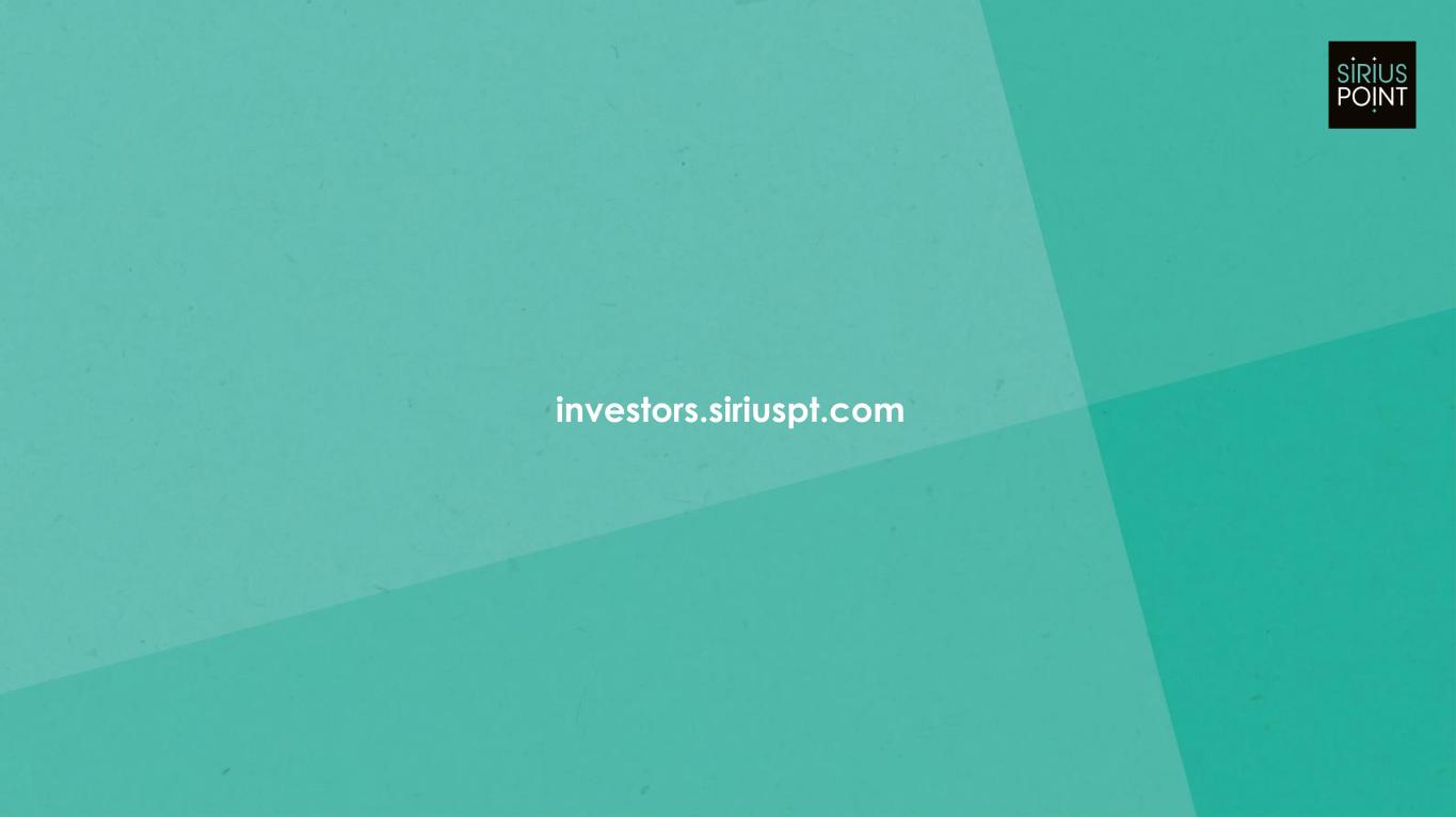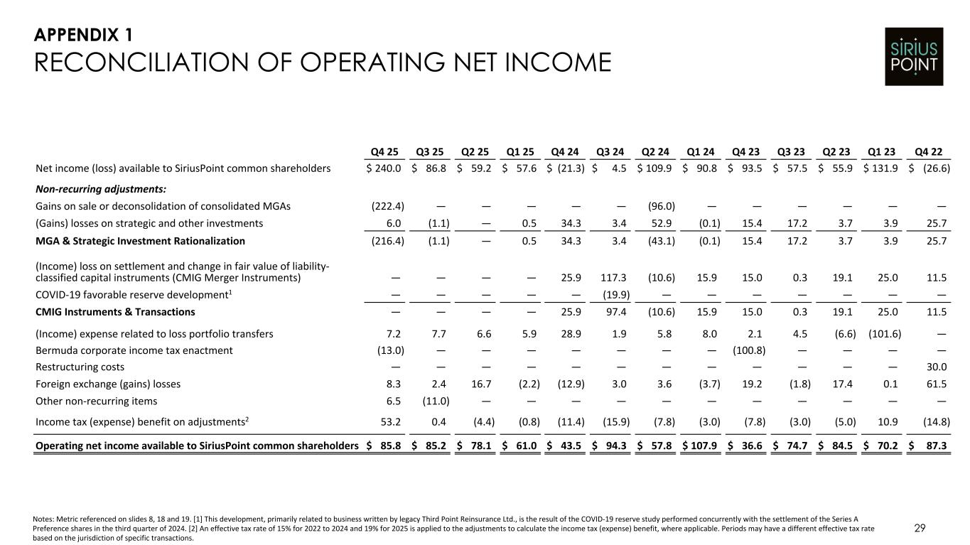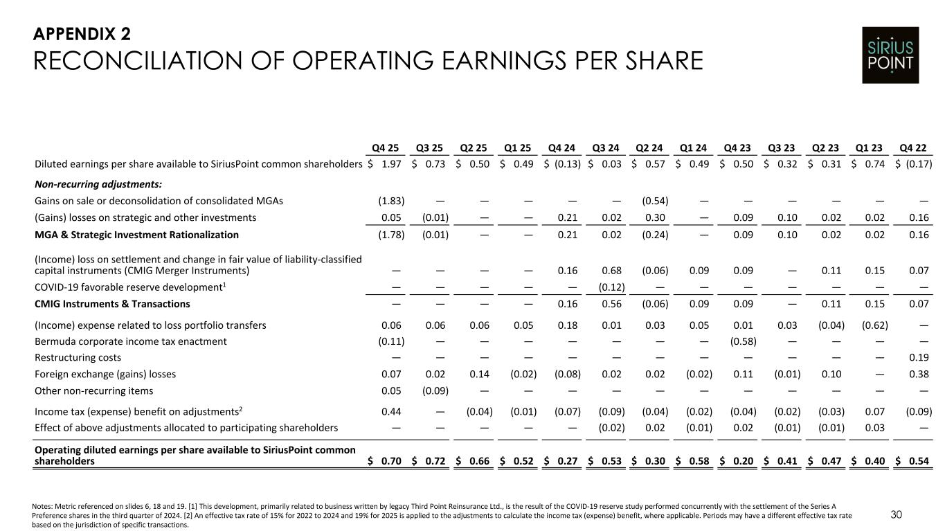 29 RECONCILIATION OF OPERATING NET INCOME Q4 25 Q3 25 Q2 25 Q1 25 Q4 24 Q3 24 Q2 24 Q1 24 Q4 23 Q3 23 Q2 23 Q1 23 Q4 22 Net income (loss) available to SiriusPoint common shareholders $ 240.0 $ 86.8 $ 59.2 $ 57.6 $ (21.3) $ 4.5 $ 109.9 $ 90.8 $ 93.5 $ 57.5 $ 55.9 $ 131.9 $ (26.6) Non-recurring adjustments: Gains on sale or deconsolidation of consolidated MGAs (222.4) — — — — — (96.0) — — — — — — (Gains) losses on strategic and other investments 6.0 (1.1) — 0.5 34.3 3.4 52.9 (0.1) 15.4 17.2 3.7 3.9 25.7 MGA & Strategic Investment Rationalization (216.4) (1.1) — 0.5 34.3 3.4 (43.1) (0.1) 15.4 17.2 3.7 3.9 25.7 (Income) loss on settlement and change in fair value of liability- classified capital instruments (CMIG Merger Instruments) — — — — 25.9 117.3 (10.6) 15.9 15.0 0.3 19.1 25.0 11.5 COVID-19 favorable reserve development1 — — — — — (19.9) — — — — — — — CMIG Instruments & Transactions — — — — 25.9 97.4 (10.6) 15.9 15.0 0.3 19.1 25.0 11.5 (Income) expense related to loss portfolio transfers 7.2 7.7 6.6 5.9 28.9 1.9 5.8 8.0 2.1 4.5 (6.6) (101.6) — Bermuda corporate income tax enactment (13.0) — — — — — — — (100.8) — — — — Restructuring costs — — — — — — — — — — — — 30.0 Foreign exchange (gains) losses 8.3 2.4 16.7 (2.2) (12.9) 3.0 3.6 (3.7) 19.2 (1.8) 17.4 0.1 61.5 Other non-recurring items 6.5 (11.0) — — — — — — — — — — — Income tax (expense) benefit on adjustments2 53.2 0.4 (4.4) (0.8) (11.4) (15.9) (7.8) (3.0) (7.8) (3.0) (5.0) 10.9 (14.8) Operating net income available to SiriusPoint common shareholders $ 85.8 $ 85.2 $ 78.1 $ 61.0 $ 43.5 $ 94.3 $ 57.8 $ 107.9 $ 36.6 $ 74.7 $ 84.5 $ 70.2 $ 87.3 Notes: Metric referenced on slides 8, 18 and 19. [1] This development, primarily related to business written by legacy Third Point Reinsurance Ltd., is the result of the COVID-19 reserve study performed concurrently with the settlement of the Series A Preference shares in the third quarter of 2024. [2] An effective tax rate of 15% for 2022 to 2024 and 19% for 2025 is applied to the adjustments to calculate the income tax (expense) benefit, where applicable. Periods may have a different effective tax rate based on the jurisdiction of specific transactions. APPENDIX 1