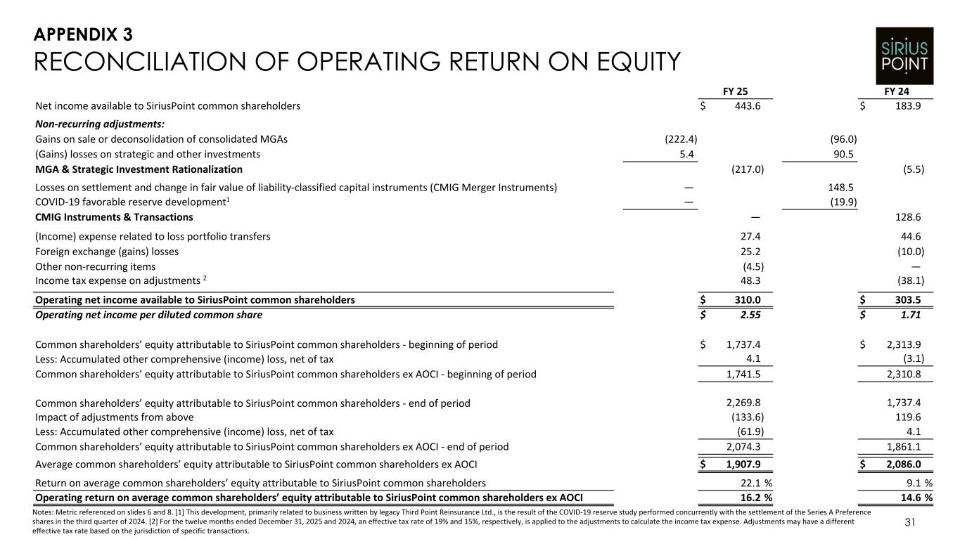 30 RECONCILIATION OF OPERATING EARNINGS PER SHARE Q4 25 Q3 25 Q2 25 Q1 25 Q4 24 Q3 24 Q2 24 Q1 24 Q4 23 Q3 23 Q2 23 Q1 23 Q4 22 Diluted earnings per share available to SiriusPoint common shareholders $ 1.97 $ 0.73 $ 0.50 $ 0.49 $ (0.13) $ 0.03 $ 0.57 $ 0.49 $ 0.50 $ 0.32 $ 0.31 $ 0.74 $ (0.17) Non-recurring adjustments: Gains on sale or deconsolidation of consolidated MGAs (1.83) — — — — — (0.54) — — — — — — (Gains) losses on strategic and other investments 0.05 (0.01) — — 0.21 0.02 0.30 — 0.09 0.10 0.02 0.02 0.16 MGA & Strategic Investment Rationalization (1.78) (0.01) — — 0.21 0.02 (0.24) — 0.09 0.10 0.02 0.02 0.16 (Income) loss on settlement and change in fair value of liability-classified capital instruments (CMIG Merger Instruments) — — — — 0.16 0.68 (0.06) 0.09 0.09 — 0.11 0.15 0.07 COVID-19 favorable reserve development1 — — — — — (0.12) — — — — — — — CMIG Instruments & Transactions — — — — 0.16 0.56 (0.06) 0.09 0.09 — 0.11 0.15 0.07 (Income) expense related to loss portfolio transfers 0.06 0.06 0.06 0.05 0.18 0.01 0.03 0.05 0.01 0.03 (0.04) (0.62) — Bermuda corporate income tax enactment (0.11) — — — — — — — (0.58) — — — — Restructuring costs — — — — — — — — — — — — 0.19 Foreign exchange (gains) losses 0.07 0.02 0.14 (0.02) (0.08) 0.02 0.02 (0.02) 0.11 (0.01) 0.10 — 0.38 Other non-recurring items 0.05 (0.09) — — — — — — — — — — — Income tax (expense) benefit on adjustments2 0.44 — (0.04) (0.01) (0.07) (0.09) (0.04) (0.02) (0.04) (0.02) (0.03) 0.07 (0.09) Effect of above adjustments allocated to participating shareholders — — — — — (0.02) 0.02 (0.01) 0.02 (0.01) (0.01) 0.03 — Operating diluted earnings per share available to SiriusPoint common shareholders $ 0.70 $ 0.72 $ 0.66 $ 0.52 $ 0.27 $ 0.53 $ 0.30 $ 0.58 $ 0.20 $ 0.41 $ 0.47 $ 0.40 $ 0.54 Notes: Metric referenced on slides 6, 18 and 19. [1] This development, primarily related to business written by legacy Third Point Reinsurance Ltd., is the result of the COVID-19 reserve study performed concurrently with the settlement of the Series A Preference shares in the third quarter of 2024. [2] An effective tax rate of 15% for 2022 to 2024 and 19% for 2025 is applied to the adjustments to calculate the income tax (expense) benefit, where applicable. Periods may have a different effective tax rate based on the jurisdiction of specific transactions. APPENDIX 2