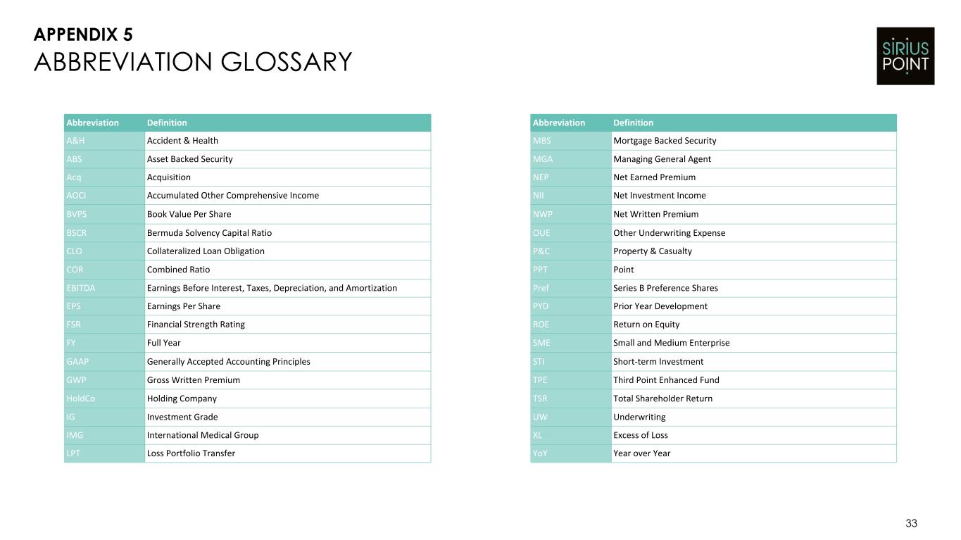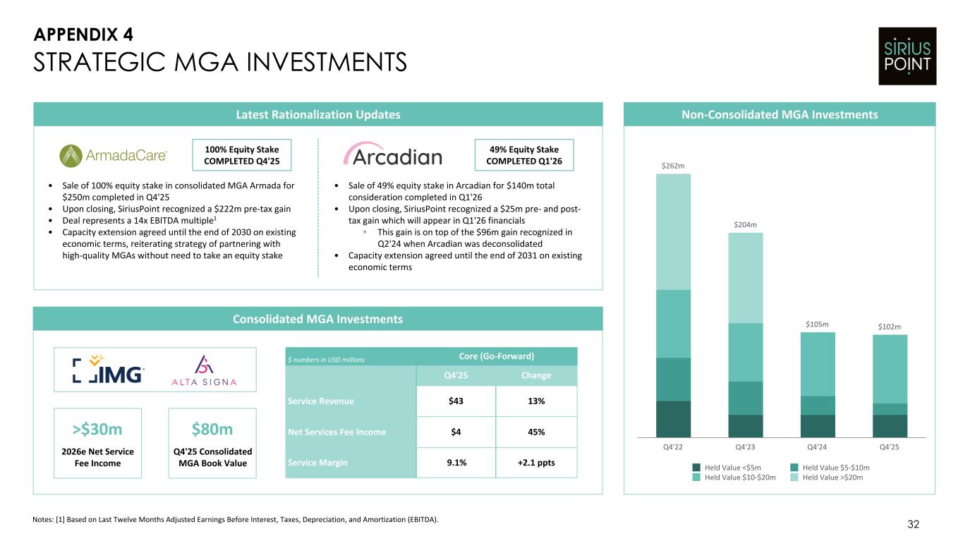 31 RECONCILIATION OF OPERATING RETURN ON EQUITY FY 25 FY 24 Net income available to SiriusPoint common shareholders $ 443.6 $ 183.9 Non-recurring adjustments: Gains on sale or deconsolidation of consolidated MGAs (222.4) (96.0) (Gains) losses on strategic and other investments 5.4 90.5 MGA & Strategic Investment Rationalization (217.0) (5.5) Losses on settlement and change in fair value of liability-classified capital instruments (CMIG Merger Instruments) — 148.5 COVID-19 favorable reserve development1 — (19.9) CMIG Instruments & Transactions — 128.6 (Income) expense related to loss portfolio transfers 27.4 44.6 Foreign exchange (gains) losses 25.2 (10.0) Other non-recurring items (4.5) — Income tax expense on adjustments 2 48.3 (38.1) Operating net income available to SiriusPoint common shareholders $ 310.0 $ 303.5 Operating net income per diluted common share $ 2.55 $ 1.71 Common shareholders’ equity attributable to SiriusPoint common shareholders - beginning of period $ 1,737.4 $ 2,313.9 Less: Accumulated other comprehensive (income) loss, net of tax 4.1 (3.1) Common shareholders’ equity attributable to SiriusPoint common shareholders ex AOCI - beginning of period 1,741.5 2,310.8 Common shareholders’ equity attributable to SiriusPoint common shareholders - end of period 2,269.8 1,737.4 Impact of adjustments from above (133.6) 119.6 Less: Accumulated other comprehensive (income) loss, net of tax (61.9) 4.1 Common shareholders’ equity attributable to SiriusPoint common shareholders ex AOCI - end of period 2,074.3 1,861.1 Average common shareholders’ equity attributable to SiriusPoint common shareholders ex AOCI $ 1,907.9 $ 2,086.0 Return on average common shareholders’ equity attributable to SiriusPoint common shareholders 22.1 % 9.1 % Operating return on average common shareholders’ equity attributable to SiriusPoint common shareholders ex AOCI 16.2 % 14.6 % Notes: Metric referenced on slides 6 and 8. [1] This development, primarily related to business written by legacy Third Point Reinsurance Ltd., is the result of the COVID-19 reserve study performed concurrently with the settlement of the Series A Preference shares in the third quarter of 2024. [2] For the twelve months ended December 31, 2025 and 2024, an effective tax rate of 19% and 15%, respectively, is applied to the adjustments to calculate the income tax expense. Adjustments may have a different effective tax rate based on the jurisdiction of specific transactions. APPENDIX 3