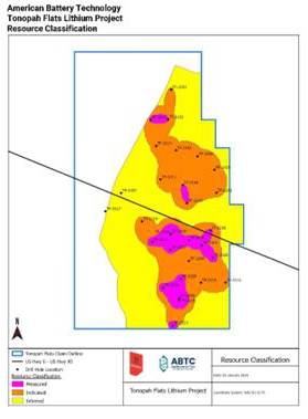 Reno, Nev., January 18, 2024American Battery Technology Company (ABTC) (NASDAQ: ABAT), an integrated critical battery materials company that is commercializing its technologies for both primary battery minerals manufacturing and secondary minerals lithium-ion battery recycling, is pleased to announce upgraded Measured Resource and Indicated Resource classifications for its Tonopah Flats Lithium Project (TFLP) located in Big Smoky Valley near Tonopah, Nevada. The favorable announcement, published in an S-K 1300 report titled Updated Resource Estimate and Initial Assessment with Project Economics for the Tonopah Flats Lithium Project, Esmeralda and Nye Counties, Nevada, USA (Updated Initial Assessment), increases the resource’s classification and attractiveness for commercialization.