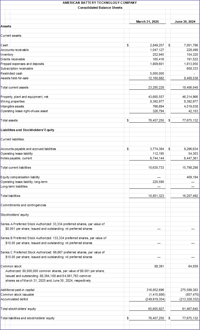This press release contains “forward-looking statements” within the meaning of the safe harbor provisions of the U.S. Private Securities Litigation Reform Act of 1995. All statements, other than statements of historical fact, are “forward-looking statements.” Although the American Battery Technology Company’s (the “Company”) management believes that such forward-looking statements are reasonable, it cannot guarantee that such expectations are, or will be, correct. These forward-looking statements involve a number of risks and uncertainties, which could cause the Company’s future results to differ materially from those anticipated. Potential risks and uncertainties include, among others, risks and uncertainties related to the Company’s ability to continue as a going concern; interpretations or reinterpretations of geologic information, unfavorable exploration results, inability to obtain permits required for future exploration, development or production, general economic conditions and conditions affecting the industries in which the Company operates; the uncertainty of regulatory requirements and approvals; fluctuating mineral and commodity prices, final investment approval and the ability to obtain necessary financing on acceptable terms or at all. Additional information regarding the factors that may cause actual results to differ materially from these forward-looking statements is available in the Company’s filings with the Securities and Exchange Commission, including the Annual Report on Form 10-K for the year ended June 30, 2024. The Company assumes no obligation to update any of the information contained or referenced in this press release.