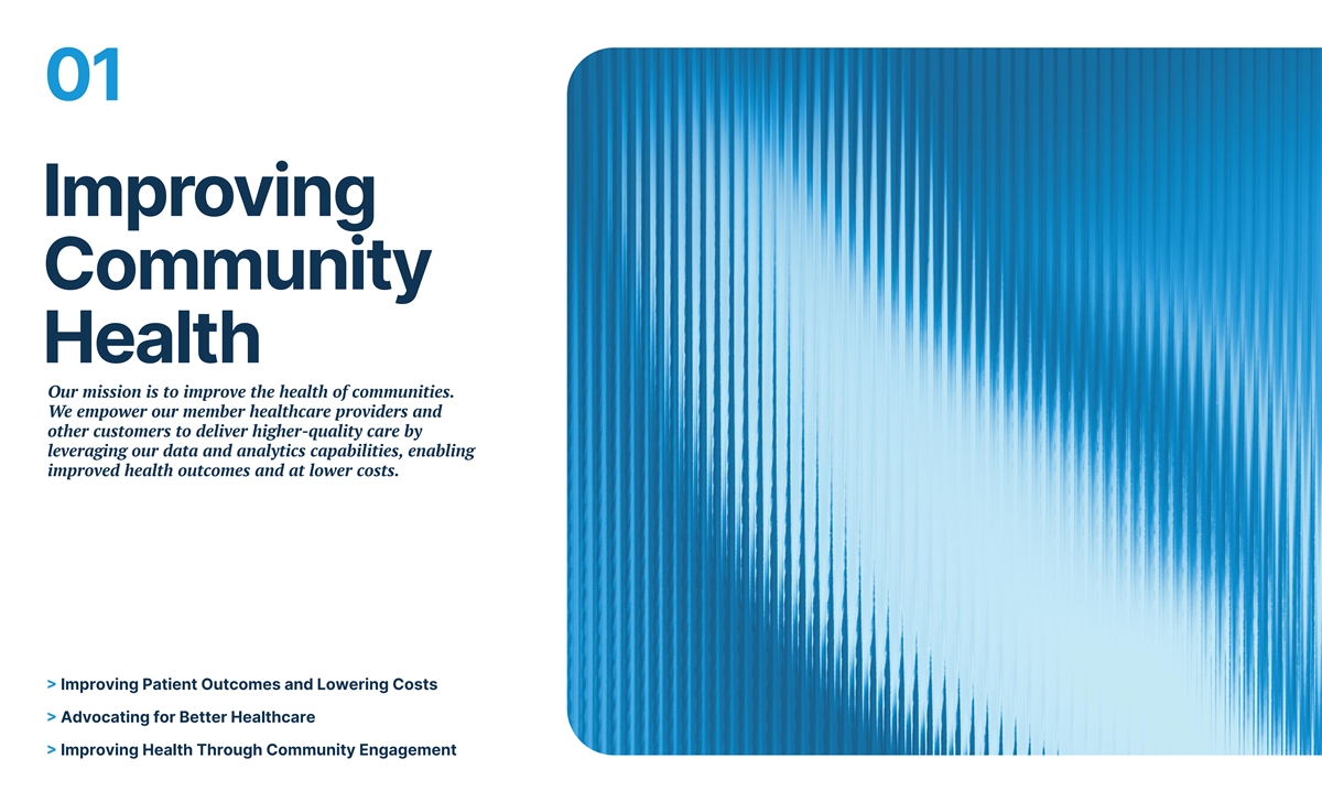01 Improving Community Health Our mission is to improve the health of communities. We empower our member healthcare providers and other customers to deliver higher-quality care by leveraging our data and analytics capabilities, enabling improved health outcomes and at lower costs. > Improving Patient Outcomes and Lowering Costs > Advocating for Better Healthcare > Improving Health Through Community Engagement