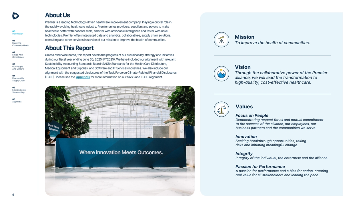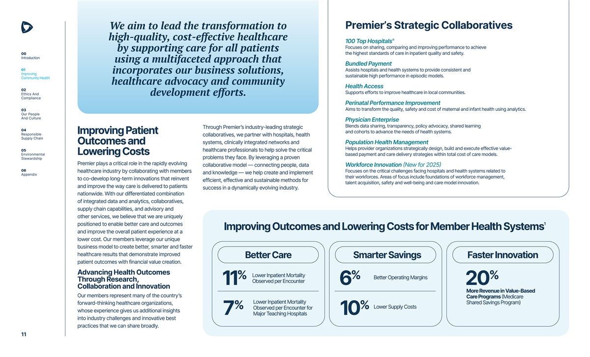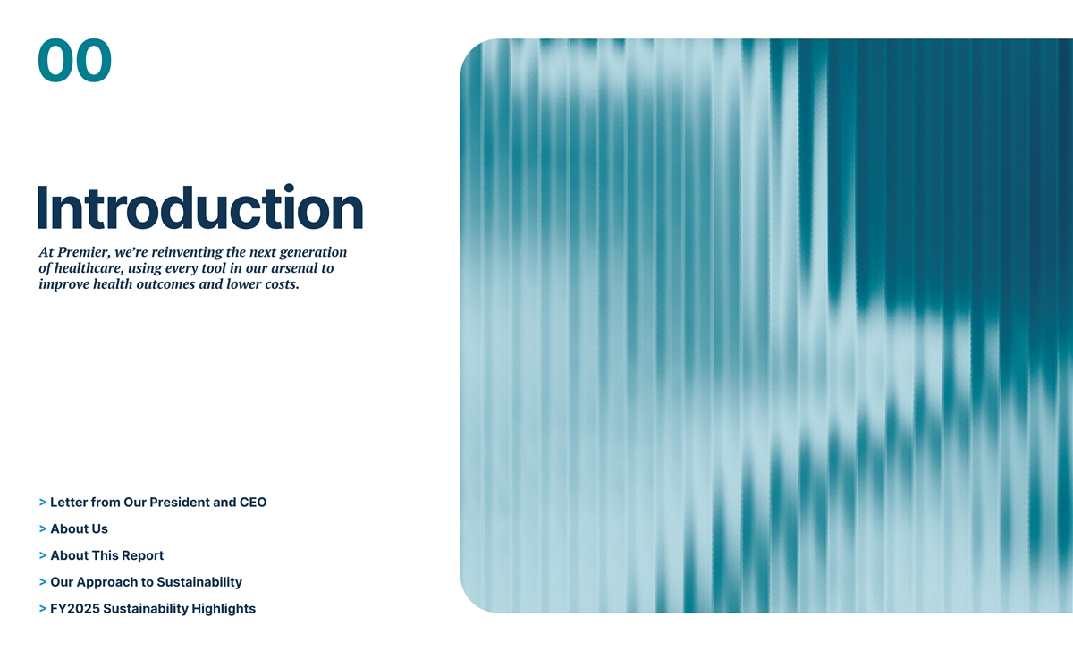 00 Introduction At Premier, we’re reinventing the next generation of healthcare, using every tool in our arsenal to improve health outcomes and lower costs. > Letter from Our President and CEO > About Us > About This Report > Our Approach to Sustainability > FY2025 Sustainability Highlights