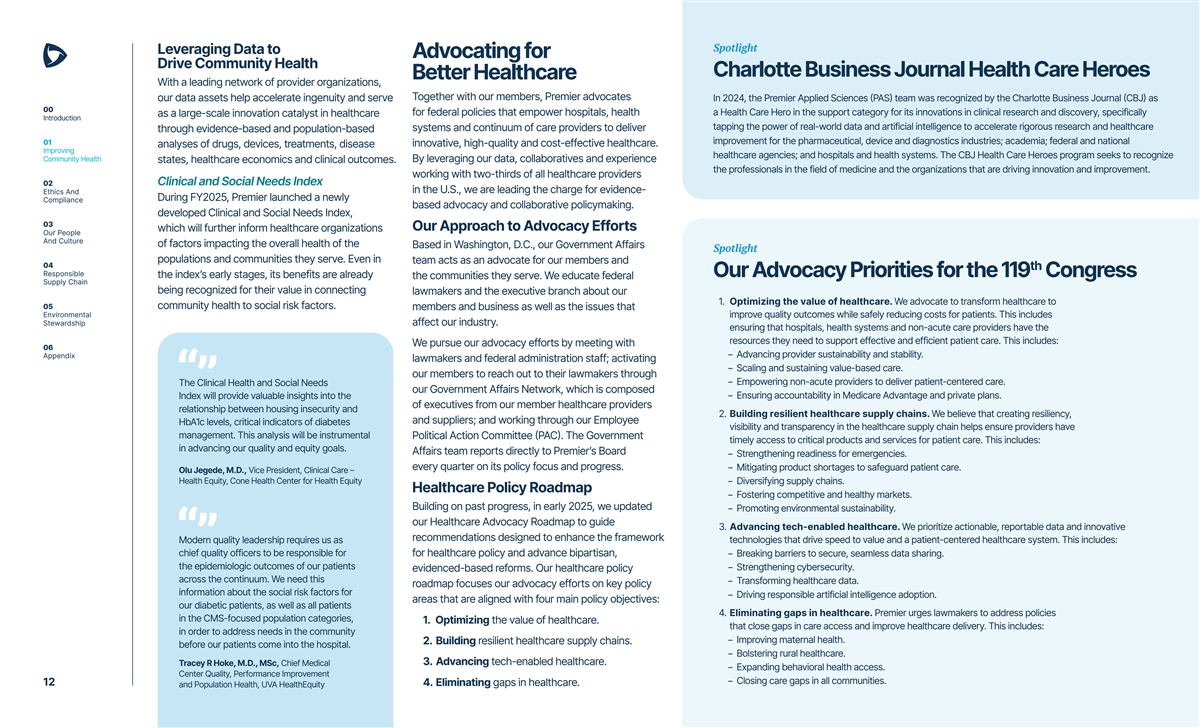 Spotlight Leveraging Data to Advocating for Drive Community Health Charlotte Business Journal Health Care Heroes Better Healthcare With a leading network of provider organizations, Together with our members, Premier advocates our data assets help accelerate ingenuity and serve In 2024, the Premier Applied Sciences (PAS) team was recognized by the Charlotte Business Journal (CBJ) as 00 for federal policies that empower hospitals, health a Health Care Hero in the support category for its innovations in clinical research and discovery, specifically as a large-scale innovation catalyst in healthcare Introduction tapping the power of real-world data and artificial intelligence to accelerate rigorous research and healthcare systems and continuum of care providers to deliver through evidence-based and population-based improvement for the pharmaceutical, device and diagnostics industries; academia; federal and national 01 innovative, high-quality and cost-effective healthcare. analyses of drugs, devices, treatments, disease Improving healthcare agencies; and hospitals and health systems. The CBJ Health Care Heroes program seeks to recognize Community Health By leveraging our data, collaboratives and experience states, healthcare economics and clinical outcomes. the professionals in the field of medicine and the organizations that are driving innovation and improvement. working with two-thirds of all healthcare providers 02 Clinical and Social Needs Index in the U.S., we are leading the charge for evidence- Ethics And During FY2025, Premier launched a newly Compliance based advocacy and collaborative policymaking. developed Clinical and Social Needs Index, 03 Our Approach to Advocacy Efforts which will further inform healthcare organizations Our People And Culture of factors impacting the overall health of the Based in Washington, D.C., our Government Affairs Spotlight populations and communities they serve. Even in team acts as an advocate for our members and 04 th Responsible Our Advocacy Priorities for the 119 Congress the index’s early stages, its benefits are already the communities they serve. We educate federal Supply Chain being recognized for their value in connecting lawmakers and the executive branch about our 1. Optimizing the value of healthcare. We advocate to transform healthcare to 05 community health to social risk factors. members and business as well as the issues that Environmental improve quality outcomes while safely reducing costs for patients. This includes Stewardship affect our industry. ensuring that hospitals, health systems and non-acute care providers have the resources they need to support effective and efficient patient care. This includes: We pursue our advocacy efforts by meeting with 06 Appendix − Advancing provider sustainability and stability. lawmakers and federal administration staff; activating − Scaling and sustaining value-based care. our members to reach out to their lawmakers through − Empowering non-acute providers to deliver patient-centered care. The Clinical Health and Social Needs our Government Affairs Network, which is composed − Ensuring accountability in Medicare Advantage and private plans. Index will provide valuable insights into the of executives from our member healthcare providers relationship between housing insecurity and 2. Building resilient healthcare supply chains. We believe that creating resiliency, and suppliers; and working through our Employee HbA1c levels, critical indicators of diabetes visibility and transparency in the healthcare supply chain helps ensure providers have management. This analysis will be instrumental Political Action Committee (PAC). The Government timely access to critical products and services for patient care. This includes: in advancing our quality and equity goals. Affairs team reports directly to Premier’s Board − Strengthening readiness for emergencies. every quarter on its policy focus and progress. − Mitigating product shortages to safeguard patient care. Olu Jegede, M.D., Vice President, Clinical Care – Health Equity, Cone Health Center for Health Equity − Diversifying supply chains. Healthcare Policy Roadmap − Fostering competitive and healthy markets. Building on past progress, in early 2025, we updated − Promoting environmental sustainability. our Healthcare Advocacy Roadmap to guide 3. Advancing tech-enabled healthcare. We prioritize actionable, reportable data and innovative recommendations designed to enhance the framework Modern quality leadership requires us as technologies that drive speed to value and a patient-centered healthcare system. This includes: chief quality officers to be responsible for for healthcare policy and advance bipartisan, − Breaking barriers to secure, seamless data sharing. the epidemiologic outcomes of our patients − Strengthening cybersecurity. evidenced-based reforms. Our healthcare policy across the continuum. We need this − Transforming healthcare data. roadmap focuses our advocacy efforts on key policy information about the social risk factors for − Driving responsible artificial intelligence adoption. areas that are aligned with four main policy objectives: our diabetic patients, as well as all patients 4. Eliminating gaps in healthcare. Premier urges lawmakers to address policies in the CMS-focused population categories, 1. Optimizing the value of healthcare. that close gaps in care access and improve healthcare delivery. This includes: in order to address needs in the community − Improving maternal health. 2. Building resilient healthcare supply chains. before our patients come into the hospital. − Bolstering rural healthcare. 3. Advancing tech-enabled healthcare. Tracey R Hoke, M.D., MSc, Chief Medical − Expanding behavioral health access. Center Quality, Performance Improvement − Closing care gaps in all communities. 12 4. Eliminating gaps in healthcare. and Population Health, UVA HealthEquity