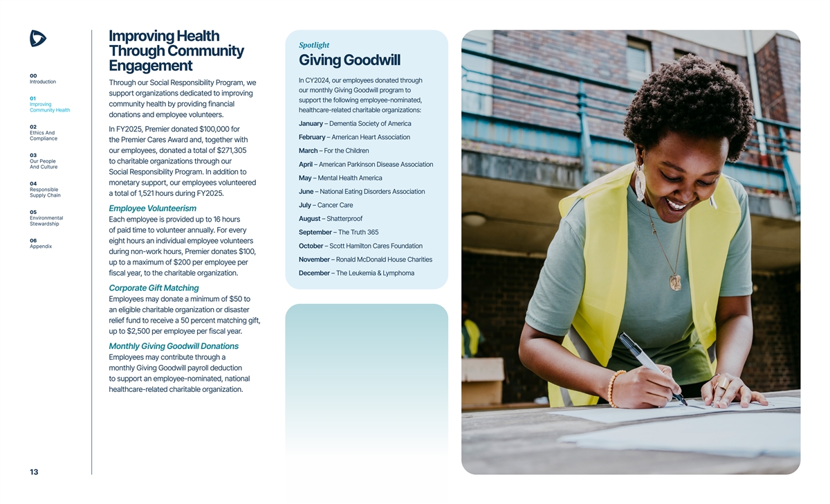Improving Health Spotlight Through Community Giving Goodwill Engagement 00 In CY2024, our employees donated through Introduction Through our Social Responsibility Program, we our monthly Giving Goodwill program to support organizations dedicated to improving 01 support the following employee-nominated, Improving community health by providing financial Community Health healthcare-related charitable organizations: donations and employee volunteers. January – Dementia Society of America 02 In FY2025, Premier donated $100,000 for Ethics And February – American Heart Association Compliance the Premier Cares Award and, together with our employees, donated a total of $271,305 March – For the Children 03 Our People to charitable organizations through our April – American Parkinson Disease Association And Culture Social Responsibility Program. In addition to May – Mental Health America 04 monetary support, our employees volunteered Responsible June – National Eating Disorders Association a total of 1,521 hours during FY2025. Supply Chain July – Cancer Care Employee Volunteerism 05 Environmental August – Shatterproof Each employee is provided up to 16 hours Stewardship of paid time to volunteer annually. For every September – The Truth 365 06 eight hours an individual employee volunteers Appendix October – Scott Hamilton Cares Foundation during non-work hours, Premier donates $100, November – Ronald McDonald House Charities up to a maximum of $200 per employee per December – The Leukemia & Lymphoma fiscal year, to the charitable organization. Corporate Gift Matching Employees may donate a minimum of $50 to an eligible charitable organization or disaster relief fund to receive a 50 percent matching gift, up to $2,500 per employee per fiscal year. Monthly Giving Goodwill Donations Employees may contribute through a monthly Giving Goodwill payroll deduction to support an employee-nominated, national healthcare-related charitable organization. 13