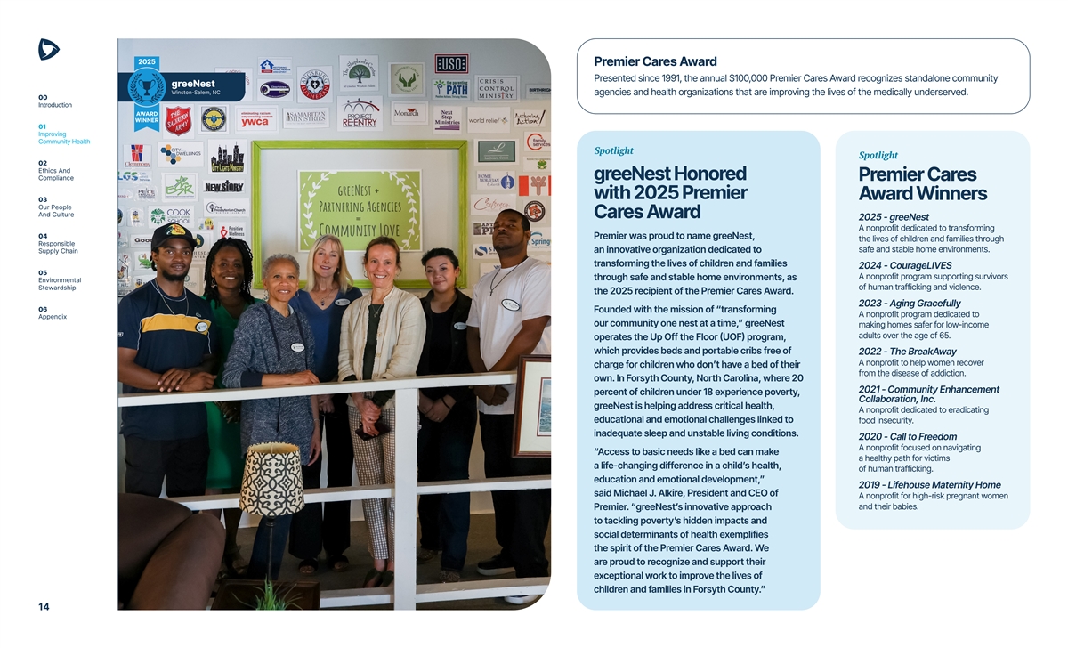 Premier Cares Award Presented since 1991, the annual $100,000 Premier Cares Award recognizes standalone community greeNest Winston-Salem, NC agencies and health organizations that are improving the lives of the medically underserved. 00 Introduction 01 Improving Community Health Spotlight Spotlight 02 Ethics And Compliance greeNest Honored Premier Cares with 2025 Premier Award Winners 03 Our People And Culture Cares Award 2025 - greeNest A nonprofit dedicated to transforming 04 Premier was proud to name greeNest, the lives of children and families through Responsible safe and stable home environments. Supply Chain an innovative organization dedicated to transforming the lives of children and families 2024 - CourageLIVES 05 A nonprofit program supporting survivors through safe and stable home environments, as Environmental Stewardship of human trafficking and violence. the 2025 recipient of the Premier Cares Award. 2023 - Aging Gracefully 06 Founded with the mission of “transforming A nonprofit program dedicated to Appendix our community one nest at a time,” greeNest making homes safer for low-income adults over the age of 65. operates the Up Off the Floor (UOF) program, which provides beds and portable cribs free of 2022 - The BreakAway A nonprofit to help women recover charge for children who don’t have a bed of their from the disease of addiction. own. In Forsyth County, North Carolina, where 20 2021 - Community Enhancement percent of children under 18 experience poverty, Collaboration, Inc. greeNest is helping address critical health, A nonprofit dedicated to eradicating educational and emotional challenges linked to food insecurity. inadequate sleep and unstable living conditions. 2020 - Call to Freedom A nonprofit focused on navigating “Access to basic needs like a bed can make a healthy path for victims a life-changing difference in a child’s health, of human trafficking. education and emotional development,” 2019 - Lifehouse Maternity Home said Michael J. Alkire, President and CEO of A nonprofit for high-risk pregnant women and their babies. Premier. “greeNest’s innovative approach to tackling poverty’s hidden impacts and social determinants of health exemplifies the spirit of the Premier Cares Award. We are proud to recognize and support their exceptional work to improve the lives of children and families in Forsyth County.” 14