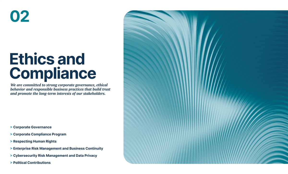 02 Ethics and Compliance We are committed to strong corporate governance, ethical behavior and responsible business practices that build trust and promote the long-term interests of our stakeholders. > Corporate Governance > Corporate Compliance Program > Respecting Human Rights > Enterprise Risk Management and Business Continuity > Cybersecurity Risk Management and Data Privacy > Political Contributions