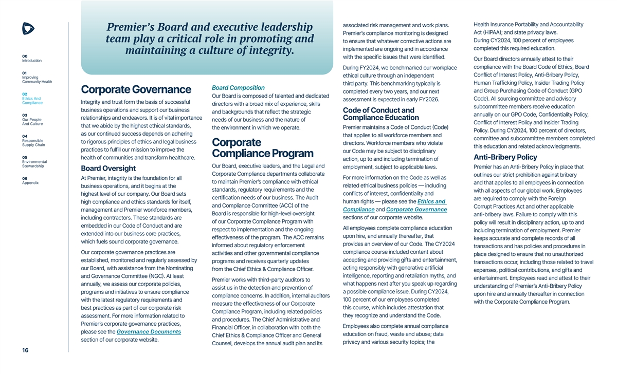 Health Insurance Portability and Accountability associated risk management and work plans. Premier’s Board and executive leadership Act (HIPAA); and state privacy laws. Premier’s compliance monitoring is designed team play a critical role in promoting and During CY2024, 100 percent of employees to ensure that whatever corrective actions are completed this required education. implemented are ongoing and in accordance maintaining a culture of integrity. 00 with the specific issues that were identified. Our Board directors annually attest to their Introduction compliance with the Board Code of Ethics, Board During FY2024, we benchmarked our workplace 01 Conflict of Interest Policy, Anti-Bribery Policy, ethical culture through an independent Improving Community Health Human Trafficking Policy, Insider Trading Policy third party. This benchmarking typically is Board Composition and Group Purchasing Code of Conduct (GPO Corporate Governance completed every two years, and our next 02 Our Board is composed of talented and dedicated Ethics And Code). All sourcing committee and advisory assessment is expected in early FY2026. Compliance Integrity and trust form the basis of successful directors with a broad mix of experience, skills subcommittee members receive education business operations and support our business Code of Conduct and and backgrounds that reflect the strategic 03 annually on our GPO Code, Confidentiality Policy, relationships and endeavors. It is of vital importance Compliance Education Our People needs of our business and the nature of Conflict of Interest Policy and Insider Trading And Culture that we abide by the highest ethical standards, Premier maintains a Code of Conduct (Code) the environment in which we operate. Policy. During CY2024, 100 percent of directors, as our continued success depends on adhering that applies to all workforce members and 04 committee and subcommittee members completed Responsible to rigorous principles of ethics and legal business directors. Workforce members who violate Supply Chain Corporate this education and related acknowledgments. practices to fulfill our mission to improve the our Code may be subject to disciplinary Compliance Program 05 health of communities and transform healthcare. Anti-Bribery Policy action, up to and including termination of Environmental Stewardship Our Board, executive leaders, and the Legal and employment, subject to applicable laws. Premier has an Anti-Bribery Policy in place that Board Oversight Corporate Compliance departments collaborate outlines our strict prohibition against bribery 06 For more information on the Code as well as At Premier, integrity is the foundation for all Appendix to maintain Premier’s compliance with ethical and that applies to all employees in connection related ethical business policies — including business operations, and it begins at the standards, regulatory requirements and the with all aspects of our global work. Employees conflicts of interest, confidentiality and highest level of our company. Our Board sets certification needs of our business. The Audit are required to comply with the Foreign human rights — please see the Ethics and high compliance and ethics standards for itself, and Compliance Committee (ACC) of the Corrupt Practices Act and other applicable Compliance and Corporate Governance management and Premier workforce members, Board is responsible for high-level oversight anti-bribery laws. Failure to comply with this sections of our corporate website. including contractors. These standards are of our Corporate Compliance Program with policy will result in disciplinary action, up to and embedded in our Code of Conduct and are All employees complete compliance education respect to implementation and the ongoing including termination of employment. Premier extended into our business core practices, upon hire, and annually thereafter, that effectiveness of the program. The ACC remains keeps accurate and complete records of all which fuels sound corporate governance. provides an overview of our Code. The CY2024 informed about regulatory enforcement transactions and has policies and procedures in compliance course included content about Our corporate governance practices are activities and other governmental compliance place designed to ensure that no unauthorized accepting and providing gifts and entertainment, established, monitored and regularly assessed by programs and receives quarterly updates transactions occur, including those related to travel acting responsibly with generative artificial our Board, with assistance from the Nominating from the Chief Ethics & Compliance Officer. expenses, political contributions, and gifts and intelligence, reporting and retaliation myths, and and Governance Committee (NGC). At least entertainment. Employees read and attest to their Premier works with third-party auditors to what happens next after you speak up regarding annually, we assess our corporate policies, understanding of Premier’s Anti-Bribery Policy assist us in the detection and prevention of a possible compliance issue. During CY2024, programs and initiatives to ensure compliance upon hire and annually thereafter in connection compliance concerns. In addition, internal auditors 100 percent of our employees completed with the latest regulatory requirements and with the Corporate Compliance Program. measure the effectiveness of our Corporate this course, which includes attestation that best practices as part of our corporate risk Compliance Program, including related policies they recognize and understand the Code. assessment. For more information related to and procedures. The Chief Administrative and Premier’s corporate governance practices, Employees also complete annual compliance Financial Officer, in collaboration with both the please see the Governance Documents education on fraud, waste and abuse; data Chief Ethics & Compliance Officer and General sec