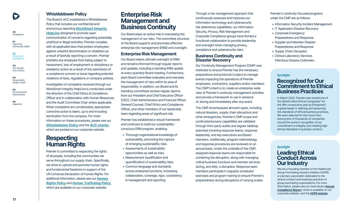 Through a risk management approach that Premier’s continuity-focused programs Whistleblower Policy Enterprise Risk continuously assesses and improves our under the CMP are as follows: The Board’s ACC established a Whistleblower Management and information technology and cybersecurity Policy that includes our confidential and • Information Security Incident Management risk deterrence capabilities, our Information Business Continuity anonymous reporting WorkSmart Integrity • IT Application Disaster Recovery 00 Security, Privacy, Risk Management and HelpLine designed to promote open • Corporate Emergency Introduction Our Board plays an active role in overseeing the Corporate Compliance groups have formed a communication of concerns regarding potentially Preparedness and Response management of our risks. The committee structure functional collaboration to provide leadership 01 unethical or illegal activities. Premier complies • Supplier and Member Disaster of the Board supports and promotes effective Improving and oversight when managing privacy, Community Health with all applicable laws that protect employees Preparedness and Response enterprise risk management (ERM) and oversight. compliance and cybersecurity risks. against unlawful discrimination or retaliation as • Supply Chain Disruption 02 Enterprise Risk Management Ethics And a result of lawfully reporting a concern. Premier • Clinical Laboratory Services Business Continuity and Compliance Our Board retains ultimate oversight of ERM prohibits any employee from being subject to Disaster Recovery Infectious Disease Outbreaks and remains informed through regular reports harassment, loss of employment or disciplinary or 03 Our Continuity Management Program (CMP) was Our People and updates, including a standing ERM update retaliatory action as a result of the submission of And Culture instituted to ensure Premier has the necessary at every quarterly Board meeting. Furthermore, a compliance concern or issue regarding potential preparations and protocols in place to manage Spotlight 04 each Board committee evaluates and oversees violations of laws, regulations or company policies. events impacting the operations of Premier Responsible Recognized for Our Supply Chain the management of risks within its area of employees, contractors, suppliers and/or members. Investigation of complaints received through our responsibility. In addition, our Board and its Commitment to Ethical The CMP’s intent is to create an enterprise-wide WorkSmart Integrity HelpLine is conducted under 05 standing committees receive regular reports Environmental Business Practices view of Premier’s continuity management activities the direction of the Chief Ethics & Compliance Stewardship from our President and Chief Executive Officer and provide a framework to use in advance In March 2025, Premier was named one of Officer and in collaboration with Human Resources (CEO), Chief Administrative and Financial Officer, ® 06 the World’s Most Ethical Companies for of, during and immediately after any event. and the Audit Committee Chair where applicable. Appendix ® General Counsel, Chief Ethics and Compliance the 18th consecutive year by Ethisphere , When complaints are corroborated, appropriate The CMP encompasses all event types, including a global leader in defining and advancing Officer, and other members of our leadership corrective action is taken, up to and including the standards of ethical business practices. natural disasters, supply chain disruptions and team regarding areas of significant risk. We were selected for this honor from termination from the company. For more other emergencies. Premier’s CMP scope and among tens of thousands of companies Premier has established a robust framework information on these procedures, please see our continuity/recovery capabilities are validated around the world in recognition of our and continues to build our sustainability- Whistleblower Policy and the ACC charter, commitment to integrity and meeting high through third-party audits and regular tabletop conscious ERM program, enabling: ethical standards in business conduct. which are posted on our corporate website. exercises involving response teams, response • Thorough organizational knowledge of leadership, and key executives and Board Respecting sustainability, promoting the capture members. Additionally, program methodology of emerging sustainability risks. and response procedures are reviewed on an Human Rights Spotlight • Assessments of sustainability annual basis. Under the umbrella of the CMP, Premier is committed to respecting the rights opportunities as well as risks. assigned response teams are responsible for Leading Ethical of all people, including the communities we • Measurement (qualification and containing the disruption, along with managing Conduct Across serve throughout our supply chain. Specifically, quantification) of sustainability risks. critical business functions and member services Our Industry we strive to uphold and promote human rights • Common language and standards during, and after, a disruption. Response team We are a founding member of the Healthcare and fundamental freedoms in support of the across enterprise functions, increasing members participate in regularly scheduled Group Purchasing Industry Initiative (HGPII), UN Universal Declaration of Human Rights. For collaboration, coverage, rigor, consistency exercises and program training to ensure Premier’s a voluntary association dedicated to the additional information, please see our Human ethical conduct and business practices of in management and reporting. preparedness during disruptions of varying scales. group purchasing organizations. For more Rights Policy and Human Trafficking Policy, information, please see our most recent Annual which are available on our corporate website. Compliance Report, which is available on our corporate website. and the HGPII 