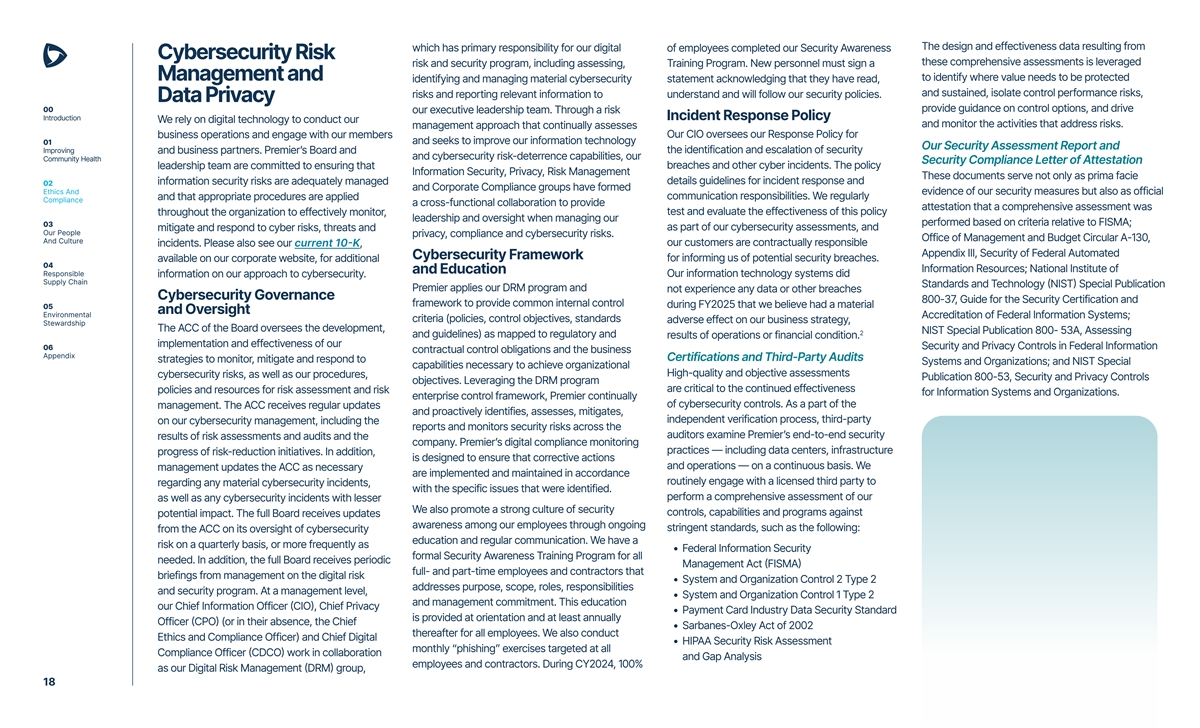 The design and effectiveness data resulting from which has primary responsibility for our digital of employees completed our Security Awareness Cybersecurity Risk these comprehensive assessments is leveraged risk and security program, including assessing, Training Program. New personnel must sign a Management and to identify where value needs to be protected identifying and managing material cybersecurity statement acknowledging that they have read, and sustained, isolate control performance risks, risks and reporting relevant information to understand and will follow our security policies. Data Privacy 00 provide guidance on control options, and drive our executive leadership team. Through a risk Introduction Incident Response Policy We rely on digital technology to conduct our and monitor the activities that address risks. management approach that continually assesses business operations and engage with our members Our CIO oversees our Response Policy for and seeks to improve our information technology 01 Our Security Assessment Report and Improving and business partners. Premier’s Board and the identification and escalation of security and cybersecurity risk-deterrence capabilities, our Community Health Security Compliance Letter of Attestation leadership team are committed to ensuring that breaches and other cyber incidents. The policy Information Security, Privacy, Risk Management These documents serve not only as prima facie information security risks are adequately managed details guidelines for incident response and 02 and Corporate Compliance groups have formed Ethics And evidence of our security measures but also as official and that appropriate procedures are applied communication responsibilities. We regularly Compliance a cross-functional collaboration to provide attestation that a comprehensive assessment was throughout the organization to effectively monitor, test and evaluate the effectiveness of this policy leadership and oversight when managing our performed based on criteria relative to FISMA; 03 mitigate and respond to cyber risks, threats and as part of our cybersecurity assessments, and Our People privacy, compliance and cybersecurity risks. Office of Management and Budget Circular A-130, And Culture incidents. Please also see our current 10-K, our customers are contractually responsible Appendix III, Security of Federal Automated Cybersecurity Framework available on our corporate website, for additional for informing us of potential security breaches. 04 Information Resources; National Institute of and Education Responsible information on our approach to cybersecurity. Our information technology systems did Supply Chain Standards and Technology (NIST) Special Publication Premier applies our DRM program and not experience any data or other breaches Cybersecurity Governance 800-37, Guide for the Security Certification and framework to provide common internal control during FY2025 that we believe had a material 05 and Oversight Environmental Accreditation of Federal Information Systems; criteria (policies, control objectives, standards adverse effect on our business strategy, Stewardship The ACC of the Board oversees the development, NIST Special Publication 800- 53A, Assessing 2 and guidelines) as mapped to regulatory and results of operations or financial condition. implementation and effectiveness of our 06 Security and Privacy Controls in Federal Information contractual control obligations and the business Appendix Certifications and Third-Party Audits strategies to monitor, mitigate and respond to Systems and Organizations; and NIST Special capabilities necessary to achieve organizational High-quality and objective assessments cybersecurity risks, as well as our procedures, Publication 800-53, Security and Privacy Controls objectives. Leveraging the DRM program are critical to the continued effectiveness policies and resources for risk assessment and risk for Information Systems and Organizations. enterprise control framework, Premier continually of cybersecurity controls. As a part of the management. The ACC receives regular updates and proactively identifies, assesses, mitigates, independent verification process, third-party on our cybersecurity management, including the reports and monitors security risks across the auditors examine Premier’s end-to-end security results of risk assessments and audits and the company. Premier’s digital compliance monitoring practices — including data centers, infrastructure progress of risk-reduction initiatives. In addition, is designed to ensure that corrective actions and operations — on a continuous basis. We management updates the ACC as necessary are implemented and maintained in accordance routinely engage with a licensed third party to regarding any material cybersecurity incidents, with the specific issues that were identified. perform a comprehensive assessment of our as well as any cybersecurity incidents with lesser We also promote a strong culture of security controls, capabilities and programs against potential impact. The full Board receives updates awareness among our employees through ongoing stringent standards, such as the following: from the ACC on its oversight of cybersecurity education and regular communication. We have a risk on a quarterly basis, or more frequently as • Federal Information Security formal Security Awareness Training Program for all needed. In addition, the full Board receives periodic Management Act (FISMA) full- and part-time employees and contractors that briefings from management on the digital risk • System and Organization Control 2 Type 2 addresses purpose, scope, roles, responsibilities and security program. At a management level, • System and Organization Control 1 Type 2 and management commitment. This education our Chief Information Officer (CIO), Chief Privacy • Payment Card Industry Data Security Standard is provided at orientation and at least annually Off