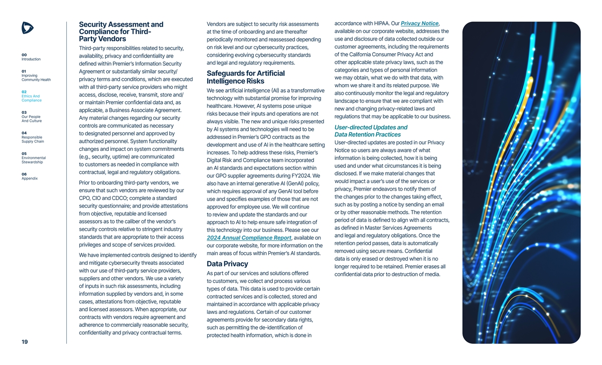 accordance with HIPAA. Our Privacy Notice, Vendors are subject to security risk assessments Security Assessment and available on our corporate website, addresses the at the time of onboarding and are thereafter Compliance for Third- use and disclosure of data collected outside our Party Vendors periodically monitored and reassessed depending customer agreements, including the requirements on risk level and our cybersecurity practices, Third-party responsibilities related to security, 00 of the California Consumer Privacy Act and considering evolving cybersecurity standards availability, privacy and confidentiality are Introduction other applicable state privacy laws, such as the and legal and regulatory requirements. defined within Premier’s Information Security categories and types of personal information 01 Agreement or substantially similar security/ Safeguards for Artificial Improving we may obtain, what we do with that data, with Community Health privacy terms and conditions, which are executed Intelligence Risks whom we share it and its related purpose. We with all third-party service providers who might We see artificial intelligence (AI) as a transformative 02 also continuously monitor the legal and regulatory access, disclose, receive, transmit, store and/ Ethics And technology with substantial promise for improving Compliance landscape to ensure that we are compliant with or maintain Premier confidential data and, as healthcare. However, AI systems pose unique new and changing privacy-related laws and applicable, a Business Associate Agreement. 03 risks because their inputs and operations are not Our People regulations that may be applicable to our business. Any material changes regarding our security And Culture always visible. The new and unique risks presented controls are communicated as necessary User-directed Updates and by AI systems and technologies will need to be 04 to designated personnel and approved by Data Retention Practices Responsible addressed in Premier’s GPO contracts as the Supply Chain authorized personnel. System functionality User-directed updates are posted in our Privacy development and use of AI in the healthcare setting changes and impact on system commitments Notice so users are always aware of what increases. To help address these risks, Premier’s 05 (e.g., security, uptime) are communicated Environmental information is being collected, how it is being Digital Risk and Compliance team incorporated Stewardship to customers as needed in compliance with used and under what circumstances it is being an AI standards and expectations section within contractual, legal and regulatory obligations. 06 disclosed. If we make material changes that our GPO supplier agreements during FY2024. We Appendix would impact a user’s use of the services or Prior to onboarding third-party vendors, we also have an internal generative AI (GenAI) policy, privacy, Premier endeavors to notify them of ensure that such vendors are reviewed by our which requires approval of any GenAI tool before the changes prior to the changes taking effect, CPO, CIO and CDCO; complete a standard use and specifies examples of those that are not such as by posting a notice by sending an email security questionnaire; and provide attestations approved for employee use. We will continue or by other reasonable methods. The retention from objective, reputable and licensed to review and update the standards and our period of data is defined to align with all contracts, assessors as to the caliber of the vendor’s approach to AI to help ensure safe integration of as defined in Master Services Agreements security controls relative to stringent industry this technology into our business. Please see our and legal and regulatory obligations. Once the standards that are appropriate to their access 2024 Annual Compliance Report, available on retention period passes, data is automatically privileges and scope of services provided. our corporate website, for more information on the removed using secure means. Confidential main areas of focus within Premier’s AI standards. We have implemented controls designed to identify data is only erased or destroyed when it is no and mitigate cybersecurity threats associated Data Privacy longer required to be retained. Premier erases all with our use of third-party service providers, As part of our services and solutions offered confidential data prior to destruction of media. suppliers and other vendors. We use a variety to customers, we collect and process various of inputs in such risk assessments, including types of data. This data is used to provide certain information supplied by vendors and, in some contracted services and is collected, stored and cases, attestations from objective, reputable maintained in accordance with applicable privacy and licensed assessors. When appropriate, our laws and regulations. Certain of our customer contracts with vendors require agreement and agreements provide for secondary data rights, adherence to commercially reasonable security, such as permitting the de-identification of confidentiality and privacy contractual terms. protected health information, which is done in 19