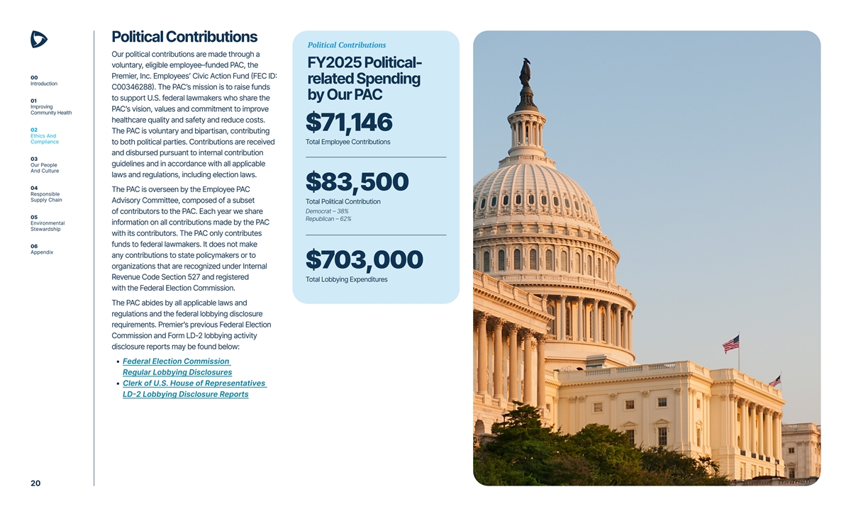 Political Contributions Political Contributions Our political contributions are made through a voluntary, eligible employee–funded PAC, the FY2025 Political- Premier, Inc. Employees’ Civic Action Fund (FEC ID: 00 related Spending Introduction C00346288). The PAC’s mission is to raise funds by Our PAC to support U.S. federal lawmakers who share the 01 Improving PAC’s vision, values and commitment to improve Community Health healthcare quality and safety and reduce costs. $71,146 02 The PAC is voluntary and bipartisan, contributing Ethics And Compliance to both political parties. Contributions are received Total Employee Contributions and disbursed pursuant to internal contribution 03 guidelines and in accordance with all applicable Our People And Culture laws and regulations, including election laws. 04 $83,500 The PAC is overseen by the Employee PAC Responsible Supply Chain Advisory Committee, composed of a subset Total Political Contribution Democrat – 38% of contributors to the PAC. Each year we share 05 Republican – 62% Environmental information on all contributions made by the PAC Stewardship with its contributors. The PAC only contributes funds to federal lawmakers. It does not make 06 Appendix any contributions to state policymakers or to $703,000 organizations that are recognized under Internal Revenue Code Section 527 and registered Total Lobbying Expenditures with the Federal Election Commission. The PAC abides by all applicable laws and regulations and the federal lobbying disclosure requirements. Premier’s previous Federal Election Commission and Form LD-2 lobbying activity disclosure reports may be found below: • Federal Election Commission Regular Lobbying Disclosures • Clerk of U.S. House of Representatives LD-2 Lobbying Disclosure Reports 20