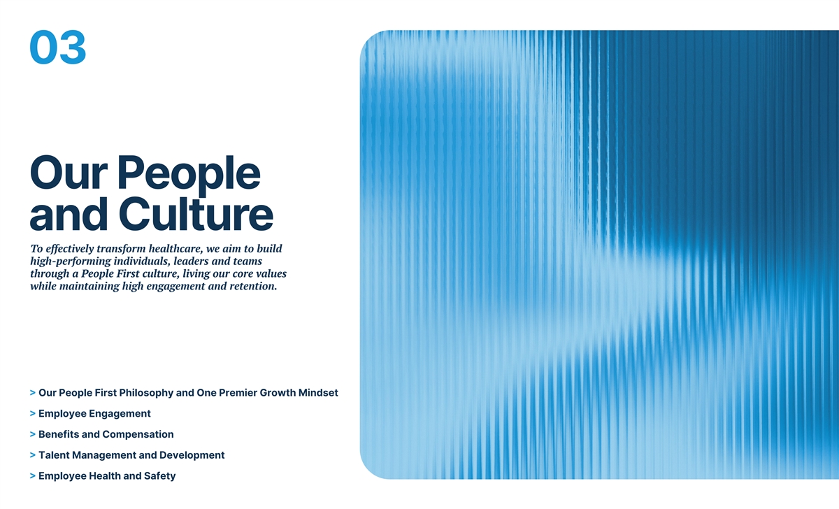 03 Our People and Culture To effectively transform healthcare, we aim to build high-performing individuals, leaders and teams through a People First culture, living our core values while maintaining high engagement and retention. > Our People First Philosophy and One Premier Growth Mindset > Employee Engagement > Benefits and Compensation > Talent Management and Development > Employee Health and Safety