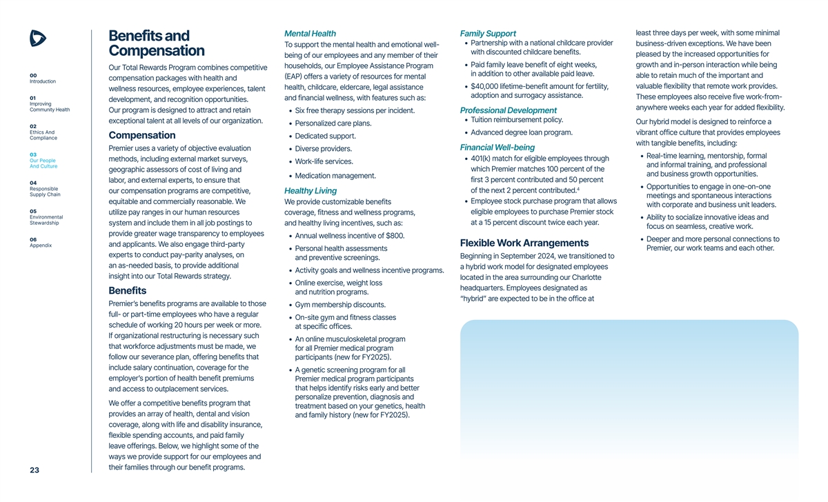 least three days per week, with some minimal Mental Health Family Support Benefits and • Partnership with a national childcare provider business-driven exceptions. We have been To support the mental health and emotional well- with discounted childcare benefits. Compensation pleased by the increased opportunities for being of our employees and any member of their • Paid family leave benefit of eight weeks, growth and in-person interaction while being households, our Employee Assistance Program Our Total Rewards Program combines competitive in addition to other available paid leave. 00 able to retain much of the important and (EAP) offers a variety of resources for mental compensation packages with health and Introduction • $40,000 lifetime-benefit amount for fertility, valuable flexibility that remote work provides. health, childcare, eldercare, legal assistance wellness resources, employee experiences, talent adoption and surrogacy assistance. These employees also receive five work-from- 01 and financial wellness, with features such as: development, and recognition opportunities. Improving anywhere weeks each year for added flexibility. Community Health Our program is designed to attract and retain • Six free therapy sessions per incident. Professional Development • Tuition reimbursement policy. exceptional talent at all levels of our organization. Our hybrid model is designed to reinforce a • Personalized care plans. 02 Ethics And • Advanced degree loan program. vibrant office culture that provides employees Compensation • Dedicated support. Compliance with tangible benefits, including: Financial Well-being Premier uses a variety of objective evaluation • Diverse providers. 03 • Real-time learning, mentorship, formal • 401(k) match for eligible employees through methods, including external market surveys, Our People • Work-life services. and informal training, and professional And Culture which Premier matches 100 percent of the geographic assessors of cost of living and and business growth opportunities. • Medication management. first 3 percent contributed and 50 percent labor, and external experts, to ensure that 04 • Opportunities to engage in one-on-one Responsible 4 of the next 2 percent contributed. our compensation programs are competitive, Healthy Living Supply Chain meetings and spontaneous interactions • Employee stock purchase program that allows equitable and commercially reasonable. We We provide customizable benefits with corporate and business unit leaders. 05 eligible employees to purchase Premier stock utilize pay ranges in our human resources coverage, fitness and wellness programs, Environmental • Ability to socialize innovative ideas and Stewardship at a 15 percent discount twice each year. system and include them in all job postings to and healthy living incentives, such as: focus on seamless, creative work. provide greater wage transparency to employees • Annual wellness incentive of $800. 06 • Deeper and more personal connections to Flexible Work Arrangements Appendix and applicants. We also engage third-party • Personal health assessments Premier, our work teams and each other. experts to conduct pay-parity analyses, on Beginning in September 2024, we transitioned to and preventive screenings. an as-needed basis, to provide additional a hybrid work model for designated employees • Activity goals and wellness incentive programs. insight into our Total Rewards strategy. located in the area surrounding our Charlotte • Online exercise, weight loss headquarters. Employees designated as Benefits and nutrition programs. “hybrid” are expected to be in the office at Premier’s benefits programs are available to those • Gym membership discounts. full- or part-time employees who have a regular • On-site gym and fitness classes schedule of working 20 hours per week or more. at specific offices. If organizational restructuring is necessary such • An online musculoskeletal program that workforce adjustments must be made, we for all Premier medical program follow our severance plan, offering benefits that participants (new for FY2025). include salary continuation, coverage for the • A genetic screening program for all employer’s portion of health benefit premiums Premier medical program participants that helps identify risks early and better and access to outplacement services. personalize prevention, diagnosis and We offer a competitive benefits program that treatment based on your genetics, health provides an array of health, dental and vision and family history (new for FY2025). coverage, along with life and disability insurance, flexible spending accounts, and paid family leave offerings. Below, we highlight some of the ways we provide support for our employees and their families through our benefit programs. 23