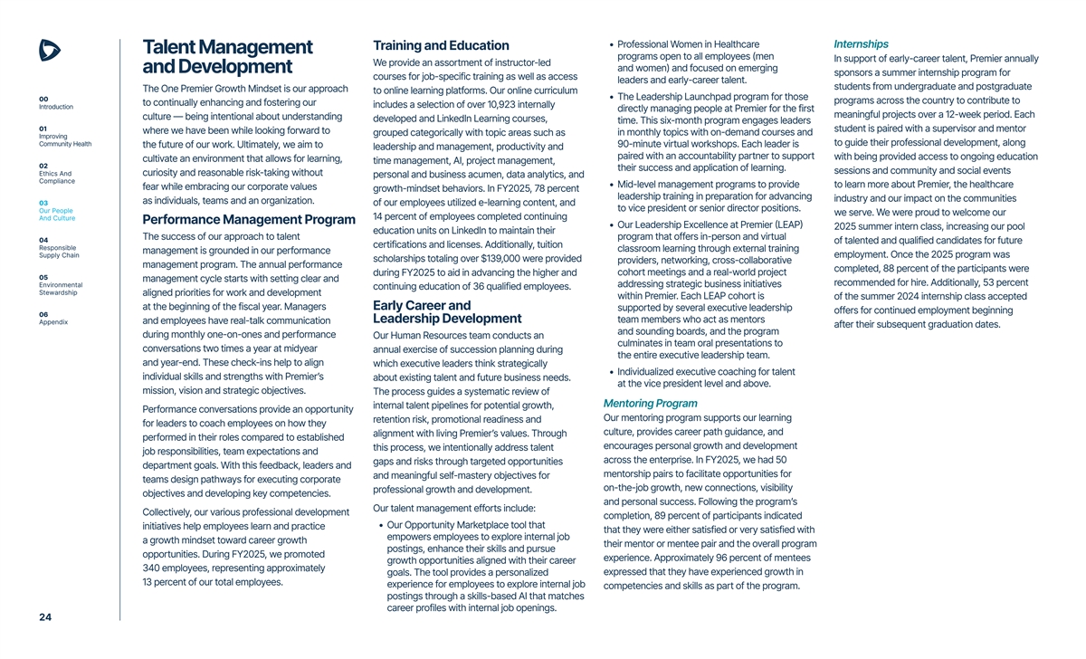 • Professional Women in Healthcare Internships Training and Education Talent Management programs open to all employees (men In support of early-career talent, Premier annually We provide an assortment of instructor-led and women) and focused on emerging and Development sponsors a summer internship program for courses for job-specific training as well as access leaders and early-career talent. students from undergraduate and postgraduate The One Premier Growth Mindset is our approach to online learning platforms. Our online curriculum • The Leadership Launchpad program for those 00 programs across the country to contribute to to continually enhancing and fostering our includes a selection of over 10,923 internally Introduction directly managing people at Premier for the first meaningful projects over a 12-week period. Each culture — being intentional about understanding developed and LinkedIn Learning courses, time. This six-month program engages leaders 01 student is paired with a supervisor and mentor where we have been while looking forward to grouped categorically with topic areas such as in monthly topics with on-demand courses and Improving to guide their professional development, along Community Health the future of our work. Ultimately, we aim to 90-minute virtual workshops. Each leader is leadership and management, productivity and paired with an accountability partner to support with being provided access to ongoing education cultivate an environment that allows for learning, time management, AI, project management, 02 their success and application of learning. sessions and community and social events Ethics And curiosity and reasonable risk-taking without personal and business acumen, data analytics, and Compliance • Mid-level management programs to provide to learn more about Premier, the healthcare fear while embracing our corporate values growth-mindset behaviors. In FY2025, 78 percent leadership training in preparation for advancing industry and our impact on the communities as individuals, teams and an organization. 03 of our employees utilized e-learning content, and to vice president or senior director positions. Our People we serve. We were proud to welcome our 14 percent of employees completed continuing And Culture Performance Management Program • Our Leadership Excellence at Premier (LEAP) 2025 summer intern class, increasing our pool education units on LinkedIn to maintain their The success of our approach to talent program that offers in-person and virtual 04 of talented and qualified candidates for future certifications and licenses. Additionally, tuition Responsible classroom learning through external training management is grounded in our performance Supply Chain employment. Once the 2025 program was scholarships totaling over $139,000 were provided providers, networking, cross-collaborative management program. The annual performance completed, 88 percent of the participants were during FY2025 to aid in advancing the higher and cohort meetings and a real-world project 05 management cycle starts with setting clear and recommended for hire. Additionally, 53 percent Environmental addressing strategic business initiatives continuing education of 36 qualified employees. Stewardship aligned priorities for work and development within Premier. Each LEAP cohort is of the summer 2024 internship class accepted at the beginning of the fiscal year. Managers Early Career and supported by several executive leadership offers for continued employment beginning 06 Leadership Development team members who act as mentors Appendix and employees have real-talk communication after their subsequent graduation dates. and sounding boards, and the program during monthly one-on-ones and performance Our Human Resources team conducts an culminates in team oral presentations to conversations two times a year at midyear annual exercise of succession planning during the entire executive leadership team. and year-end. These check-ins help to align which executive leaders think strategically • Individualized executive coaching for talent individual skills and strengths with Premier’s about existing talent and future business needs. at the vice president level and above. mission, vision and strategic objectives. The process guides a systematic review of Mentoring Program internal talent pipelines for potential growth, Performance conversations provide an opportunity Our mentoring program supports our learning retention risk, promotional readiness and for leaders to coach employees on how they culture, provides career path guidance, and alignment with living Premier’s values. Through performed in their roles compared to established encourages personal growth and development this process, we intentionally address talent job responsibilities, team expectations and across the enterprise. In FY2025, we had 50 gaps and risks through targeted opportunities department goals. With this feedback, leaders and mentorship pairs to facilitate opportunities for and meaningful self-mastery objectives for teams design pathways for executing corporate on-the-job growth, new connections, visibility professional growth and development. objectives and developing key competencies. and personal success. Following the program’s Our talent management efforts include: Collectively, our various professional development completion, 89 percent of participants indicated • Our Opportunity Marketplace tool that initiatives help employees learn and practice that they were either satisfied or very satisfied with empowers employees to explore internal job a growth mindset toward career growth their mentor or mentee pair and the overall program postings, enhance their skills and pursue opportunities. During FY2025, we promoted experience. Approximately 96 percent of mentees growth opportunities aligned with their career 340 employees, representing approximately expressed that they have experienced growth in goals.