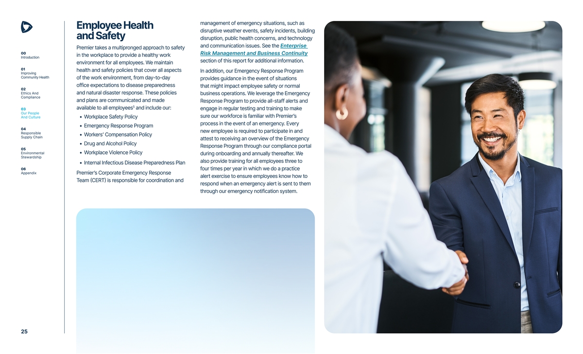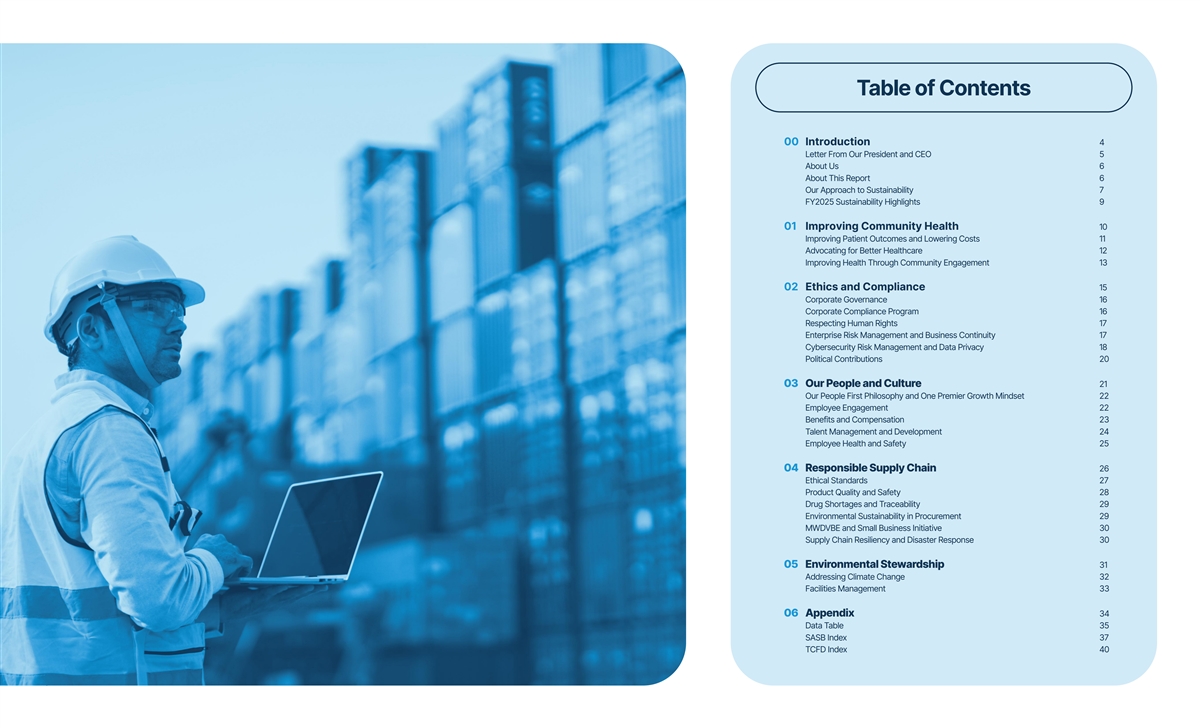 Table of Contents 00 Introduction 01 00 Introduction 4 Improving Letter From Our President and CEO 5 Community Health About Us 6 About This Report 6 02 Our Approach to Sustainability 7 Ethics And Compliance FY2025 Sustainability Highlights 9 03 01 Improving Community Health 10 Our People Improving Patient Outcomes and Lowering Costs 11 And Culture Advocating for Better Healthcare 12 Improving Health Through Community Engagement 13 04 Responsible Supply Chain 02 Ethics and Compliance 15 Corporate Governance 16 05 Corporate Compliance Program 16 Environmental Stewardship Respecting Human Rights 17 Enterprise Risk Management and Business Continuity 17 06 Cybersecurity Risk Management and Data Privacy 18 Appendix Political Contributions 20 03 Our People and Culture 21 Our People First Philosophy and One Premier Growth Mindset 22 Employee Engagement 22 Benefits and Compensation 23 Talent Management and Development 24 Employee Health and Safety 25 04 Responsible Supply Chain 26 Ethical Standards 27 Product Quality and Safety 28 Drug Shortages and Traceability 29 Environmental Sustainability in Procurement 29 MWDVBE and Small Business Initiative 30 Supply Chain Resiliency and Disaster Response 30 05 Environmental Stewardship 31 Addressing Climate Change 32 Facilities Management 33 06 Appendix 34 Data Table 35 SASB Index 37 TCFD Index 40 3