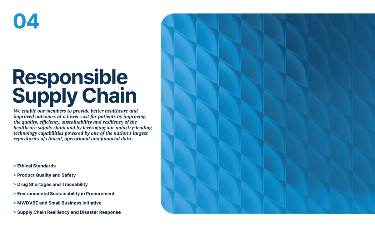 04 Responsible Supply Chain We enable our members to provide better healthcare and improved outcomes at a lower cost for patients by improving the quality, efficiency, sustainability and resiliency of the healthcare supply chain and by leveraging our industry-leading technology capabilities powered by one of the nation’s largest repositories of clinical, operational and financial data. > Ethical Standards > Product Quality and Safety > Drug Shortages and Traceability > Environmental Sustainability in Procurement > MWDVBE and Small Business Initiative > Supply Chain Resiliency and Disaster Response