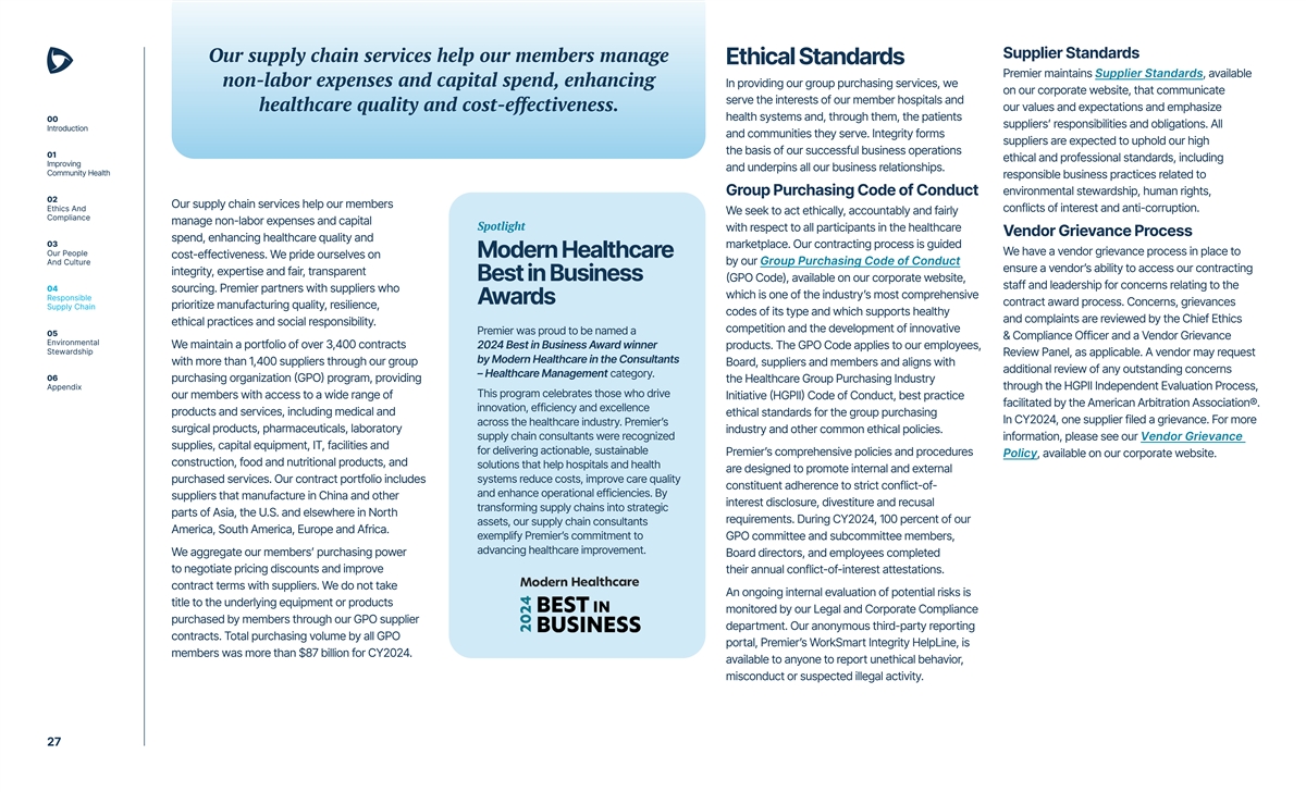 Supplier Standards Our supply chain services help our members manage Ethical Standards Premier maintains Supplier Standards, available non-labor expenses and capital spend, enhancing In providing our group purchasing services, we on our corporate website, that communicate serve the interests of our member hospitals and healthcare quality and cost-effectiveness. our values and expectations and emphasize health systems and, through them, the patients 00 suppliers’ responsibilities and obligations. All Introduction and communities they serve. Integrity forms suppliers are expected to uphold our high the basis of our successful business operations 01 ethical and professional standards, including Improving and underpins all our business relationships. Community Health responsible business practices related to Group Purchasing Code of Conduct environmental stewardship, human rights, 02 Our supply chain services help our members Ethics And conflicts of interest and anti-corruption. We seek to act ethically, accountably and fairly Compliance manage non-labor expenses and capital Spotlight with respect to all participants in the healthcare Vendor Grievance Process spend, enhancing healthcare quality and 03 marketplace. Our contracting process is guided We have a vendor grievance process in place to Our People Modern Healthcare cost-effectiveness. We pride ourselves on And Culture by our Group Purchasing Code of Conduct ensure a vendor’s ability to access our contracting integrity, expertise and fair, transparent Best in Business (GPO Code), available on our corporate website, staff and leadership for concerns relating to the 04 sourcing. Premier partners with suppliers who which is one of the industry’s most comprehensive Responsible Awards contract award process. Concerns, grievances Supply Chain prioritize manufacturing quality, resilience, codes of its type and which supports healthy and complaints are reviewed by the Chief Ethics ethical practices and social responsibility. competition and the development of innovative Premier was proud to be named a 05 & Compliance Officer and a Vendor Grievance Environmental We maintain a portfolio of over 3,400 contracts 2024 Best in Business Award winner products. The GPO Code applies to our employees, Stewardship Review Panel, as applicable. A vendor may request by Modern Healthcare in the Consultants with more than 1,400 suppliers through our group Board, suppliers and members and aligns with additional review of any outstanding concerns – Healthcare Management category. 06 purchasing organization (GPO) program, providing the Healthcare Group Purchasing Industry Appendix through the HGPII Independent Evaluation Process, This program celebrates those who drive our members with access to a wide range of Initiative (HGPII) Code of Conduct, best practice facilitated by the American Arbitration Association®. innovation, efficiency and excellence products and services, including medical and ethical standards for the group purchasing In CY2024, one supplier filed a grievance. For more across the healthcare industry. Premier’s surgical products, pharmaceuticals, laboratory industry and other common ethical policies. supply chain consultants were recognized information, please see our Vendor Grievance supplies, capital equipment, IT, facilities and for delivering actionable, sustainable Premier’s comprehensive policies and procedures Policy, available on our corporate website. construction, food and nutritional products, and solutions that help hospitals and health are designed to promote internal and external purchased services. Our contract portfolio includes systems reduce costs, improve care quality constituent adherence to strict conflict-of- and enhance operational efficiencies. By suppliers that manufacture in China and other interest disclosure, divestiture and recusal transforming supply chains into strategic parts of Asia, the U.S. and elsewhere in North requirements. During CY2024, 100 percent of our assets, our supply chain consultants America, South America, Europe and Africa. exemplify Premier’s commitment to GPO committee and subcommittee members, advancing healthcare improvement. We aggregate our members’ purchasing power Board directors, and employees completed to negotiate pricing discounts and improve their annual conflict-of-interest attestations. contract terms with suppliers. We do not take An ongoing internal evaluation of potential risks is title to the underlying equipment or products monitored by our Legal and Corporate Compliance purchased by members through our GPO supplier department. Our anonymous third-party reporting contracts. Total purchasing volume by all GPO portal, Premier’s WorkSmart Integrity HelpLine, is members was more than $87 billion for CY2024. available to anyone to report unethical behavior, misconduct or suspected illegal activity. 27