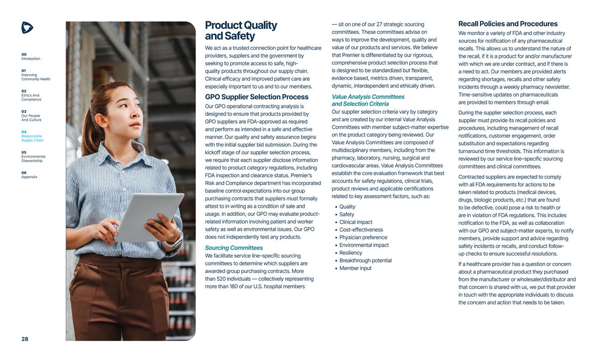 — sit on one of our 27 strategic sourcing Recall Policies and Procedures Product Quality committees. These committees advise on We monitor a variety of FDA and other industry and Safety ways to improve the development, quality and sources for notification of any pharmaceutical value of our products and services. We believe We act as a trusted connection point for healthcare recalls. This allows us to understand the nature of 00 that Premier is differentiated by our rigorous, providers, suppliers and the government by the recall, if it is a product for and/or manufacturer Introduction comprehensive product selection process that seeking to promote access to safe, high- with which we are under contract, and if there is 01 is designed to be standardized but flexible, quality products throughout our supply chain. a need to act. Our members are provided alerts Improving evidence based, metrics driven, transparent, Community Health Clinical efficacy and improved patient care are regarding shortages, recalls and other safety dynamic, interdependent and ethically driven. especially important to us and to our members. incidents through a weekly pharmacy newsletter. 02 Ethics And Time-sensitive updates on pharmaceuticals Value Analysis Committees GPO Supplier Selection Process Compliance are provided to members through email. and Selection Criteria Our GPO operational contracting analysis is 03 Our supplier selection criteria vary by category During the supplier selection process, each designed to ensure that products provided by Our People And Culture and are created by our internal Value Analysis supplier must provide its recall policies and GPO suppliers are FDA-approved as required Committees with member subject-matter expertise procedures, including management of recall and perform as intended in a safe and effective 04 on the product category being reviewed. Our Responsible notifications, customer engagement, order manner. Our quality and safety assurance begins Supply Chain Value Analysis Committees are composed of substitution and expectations regarding with the initial supplier bid submission. During the multidisciplinary members, including from the turnaround time thresholds. This information is 05 kickoff stage of our supplier selection process, Environmental pharmacy, laboratory, nursing, surgical and reviewed by our service line–specific sourcing Stewardship we require that each supplier disclose information cardiovascular areas. Value Analysis Committees committees and clinical committees. related to product category regulations, including 06 establish the core evaluation framework that best FDA inspection and clearance status. Premier’s Appendix Contracted suppliers are expected to comply accounts for safety regulations, clinical trials, Risk and Compliance department has incorporated with all FDA requirements for actions to be product reviews and applicable certifications baseline control expectations into our group taken related to products (medical devices, related to key assessment factors, such as: purchasing contracts that suppliers must formally drugs, biologic products, etc.) that are found attest to in writing as a condition of sale and • Quality to be defective, could pose a risk to health or usage. In addition, our GPO may evaluate product- • Safety are in violation of FDA regulations. This includes related information involving patient and worker • Clinical impact notification to the FDA, as well as collaboration safety as well as environmental issues. Our GPO • Cost-effectiveness with our GPO and subject-matter experts, to notify does not independently test any products. • Physician preference members, provide support and advice regarding • Environmental impact safety incidents or recalls, and conduct follow- Sourcing Committees • Resiliency up checks to ensure successful resolutions. We facilitate service line–specific sourcing • Breakthrough potential committees to determine which suppliers are If a healthcare provider has a question or concern • Member input awarded group purchasing contracts. More about a pharmaceutical product they purchased than 520 individuals — collectively representing from the manufacturer or wholesaler/distributor and more than 180 of our U.S. hospital members that concern is shared with us, we put that provider in touch with the appropriate individuals to discuss the concern and action that needs to be taken. 28