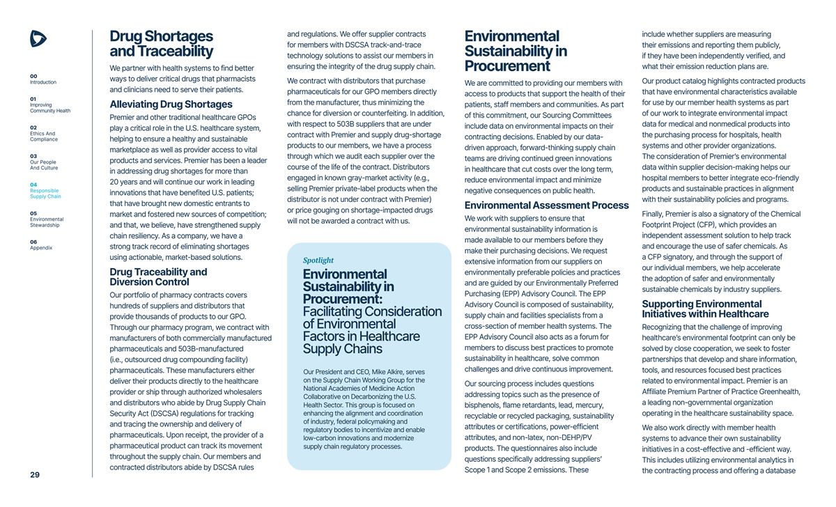 and regulations. We offer supplier contracts include whether suppliers are measuring Drug Shortages Environmental for members with DSCSA track-and-trace their emissions and reporting them publicly, and Traceability Sustainability in technology solutions to assist our members in if they have been independently verified, and ensuring the integrity of the drug supply chain. what their emission reduction plans are. We partner with health systems to find better Procurement 00 ways to deliver critical drugs that pharmacists Introduction We contract with distributors that purchase Our product catalog highlights contracted products We are committed to providing our members with and clinicians need to serve their patients. pharmaceuticals for our GPO members directly that have environmental characteristics available access to products that support the health of their 01 from the manufacturer, thus minimizing the for use by our member health systems as part Improving patients, staff members and communities. As part Alleviating Drug Shortages Community Health chance for diversion or counterfeiting. In addition, of our work to integrate environmental impact of this commitment, our Sourcing Committees Premier and other traditional healthcare GPOs with respect to 503B suppliers that are under data for medical and nonmedical products into include data on environmental impacts on their 02 play a critical role in the U.S. healthcare system, Ethics And contract with Premier and supply drug-shortage the purchasing process for hospitals, health contracting decisions. Enabled by our data- Compliance helping to ensure a healthy and sustainable products to our members, we have a process systems and other provider organizations. driven approach, forward-thinking supply chain marketplace as well as provider access to vital 03 through which we audit each supplier over the The consideration of Premier’s environmental teams are driving continued green innovations products and services. Premier has been a leader Our People And Culture course of the life of the contract. Distributors data within supplier decision-making helps our in healthcare that cut costs over the long term, in addressing drug shortages for more than engaged in known gray-market activity (e.g., hospital members to better integrate eco-friendly reduce environmental impact and minimize 20 years and will continue our work in leading 04 selling Premier private-label products when the products and sustainable practices in alignment Responsible negative consequences on public health. innovations that have benefited U.S. patients; Supply Chain distributor is not under contract with Premier) with their sustainability policies and programs. that have brought new domestic entrants to Environmental Assessment Process or price gouging on shortage-impacted drugs 05 Finally, Premier is also a signatory of the Chemical market and fostered new sources of competition; Environmental We work with suppliers to ensure that will not be awarded a contract with us. Stewardship Footprint Project (CFP), which provides an and that, we believe, have strengthened supply environmental sustainability information is independent assessment solution to help track chain resiliency. As a company, we have a made available to our members before they 06 and encourage the use of safer chemicals. As Appendix strong track record of eliminating shortages make their purchasing decisions. We request a CFP signatory, and through the support of using actionable, market-based solutions. Spotlight extensive information from our suppliers on our individual members, we help accelerate environmentally preferable policies and practices Drug Traceability and Environmental the adoption of safer and environmentally Diversion Control and are guided by our Environmentally Preferred Sustainability in sustainable chemicals by industry suppliers. Purchasing (EPP) Advisory Council. The EPP Our portfolio of pharmacy contracts covers Procurement: Advisory Council is composed of sustainability, Supporting Environmental hundreds of suppliers and distributors that Facilitating Consideration Initiatives within Healthcare supply chain and facilities specialists from a provide thousands of products to our GPO. of Environmental cross-section of member health systems. The Through our pharmacy program, we contract with Recognizing that the challenge of improving EPP Advisory Council also acts as a forum for manufacturers of both commercially manufactured healthcare’s environmental footprint can only be Factors in Healthcare members to discuss best practices to promote pharmaceuticals and 503B-manufactured solved by close cooperation, we seek to foster Supply Chains sustainability in healthcare, solve common (i.e., outsourced drug compounding facility) partnerships that develop and share information, challenges and drive continuous improvement. pharmaceuticals. These manufacturers either tools, and resources focused best practices Our President and CEO, Mike Alkire, serves on the Supply Chain Working Group for the deliver their products directly to the healthcare related to environmental impact. Premier is an Our sourcing process includes questions National Academies of Medicine Action provider or ship through authorized wholesalers Affiliate Premium Partner of Practice Greenhealth, addressing topics such as the presence of Collaborative on Decarbonizing the U.S. and distributors who abide by Drug Supply Chain a leading non-governmental organization Health Sector. This group is focused on bisphenols, flame retardants, lead, mercury, Security Act (DSCSA) regulations for tracking enhancing the alignment and coordination operating in the healthcare sustainability space. recyclable or recycled packaging, sustainability of industry, federal policymaking and and tracing the ownership and delivery of attributes or certifications, power-efficient We also work directly with member health regulatory bodies to incentivize and 