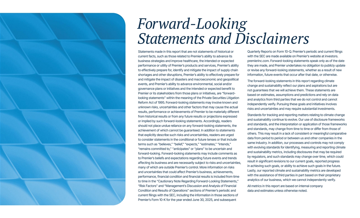 Forward-Looking Statements and Disclaimers Statements made in this report that are not statements of historical or Quarterly Reports on Form 10-Q. Premier’s periodic and current filings current facts, such as those related to Premier’s ability to advance its with the SEC are made available on Premier’s website at investors. business strategies and improve healthcare, the intended or expected premierinc.com. Forward-looking statements speak only as of the date performance or utility of Premier’s products and services, Premier’s ability they are made, and Premier undertakes no obligation to publicly update to effectively prepare for, identify and mitigate the impact of supply chain or revise any forward-looking statements, whether as a result of new shortages and other disruptions, Premier’s ability to effectively prepare for information, future events that occur after that date, or otherwise. and mitigate the impact of disasters and macroeconomic and geopolitical The forward-looking statements in this report regarding climate events, and Premier’s ability to advance environmental, social and/or change and sustainability reflect our plans and aspirations but are governance plans or initiatives and the intended or expected benefit to not guarantees that we will achieve them. These statements are Premier or its stakeholders from those plans or initiatives, are “forward- based on estimates, assumptions and predictions and rely on data looking statements” within the meaning of the Private Securities Litigation and analytics from third parties that we do not control and cannot Reform Act of 1995. Forward-looking statements may involve known and independently verify. Pursuing these goals and initiatives involves unknown risks, uncertainties and other factors that may cause the actual risks and uncertainties and may require substantial investments. results, performance or achievements of Premier to be materially different Standards for tracking and reporting matters relating to climate change from historical results or from any future results or projections expressed and sustainability continue to evolve. Our use of disclosure frameworks or implied by such forward-looking statements. Accordingly, readers and standards, and the interpretation or application of those frameworks should not place undue reliance on any forward-looking statements, the and standards, may change from time to time or differ from those of achievement of which cannot be guaranteed. In addition to statements others. This may result in a lack of consistent or meaningful comparative that explicitly describe such risks and uncertainties, readers are urged data from period to period or between us and other companies in the to consider statements in the conditional or future tenses or that include same industry. In addition, our processes and controls may not comply terms such as “believes,” “belief,” “expects,” “estimates,” “intends,” with evolving standards for identifying, measuring and reporting climate “remains committed to,” “anticipates” or “plans” to be uncertain and and sustainability metrics, including disclosures that may be required forward-looking. Forward-looking statements may include comments as by regulators, and such standards may change over time, which could to Premier’s beliefs and expectations regarding future events and trends result in significant revisions to our current goals, reported progress affecting its business and are necessarily subject to risks and uncertainties, in achieving such goals, or ability to achieve such goals in the future. many of which are outside Premier’s control. More information on risks Lastly, our reported climate and sustainability metrics are developed and uncertainties that could affect Premier’s business, achievements, with the assistance of third parties in part based on their proprietary performance, financial condition and financial results is included from time analytics of our business, which we cannot independently verify. to time in the “Cautionary Note Regarding Forward-Looking Statements,” “Risk Factors” and “Management’s Discussion and Analysis of Financial All metrics in this report are based on internal company Condition and Results of Operations” sections of Premier’s periodic and data and estimates unless otherwise noted. current filings with the SEC, including the information in those sections of Premier’s Form 10-K for the year ended June 30, 2025, and subsequent