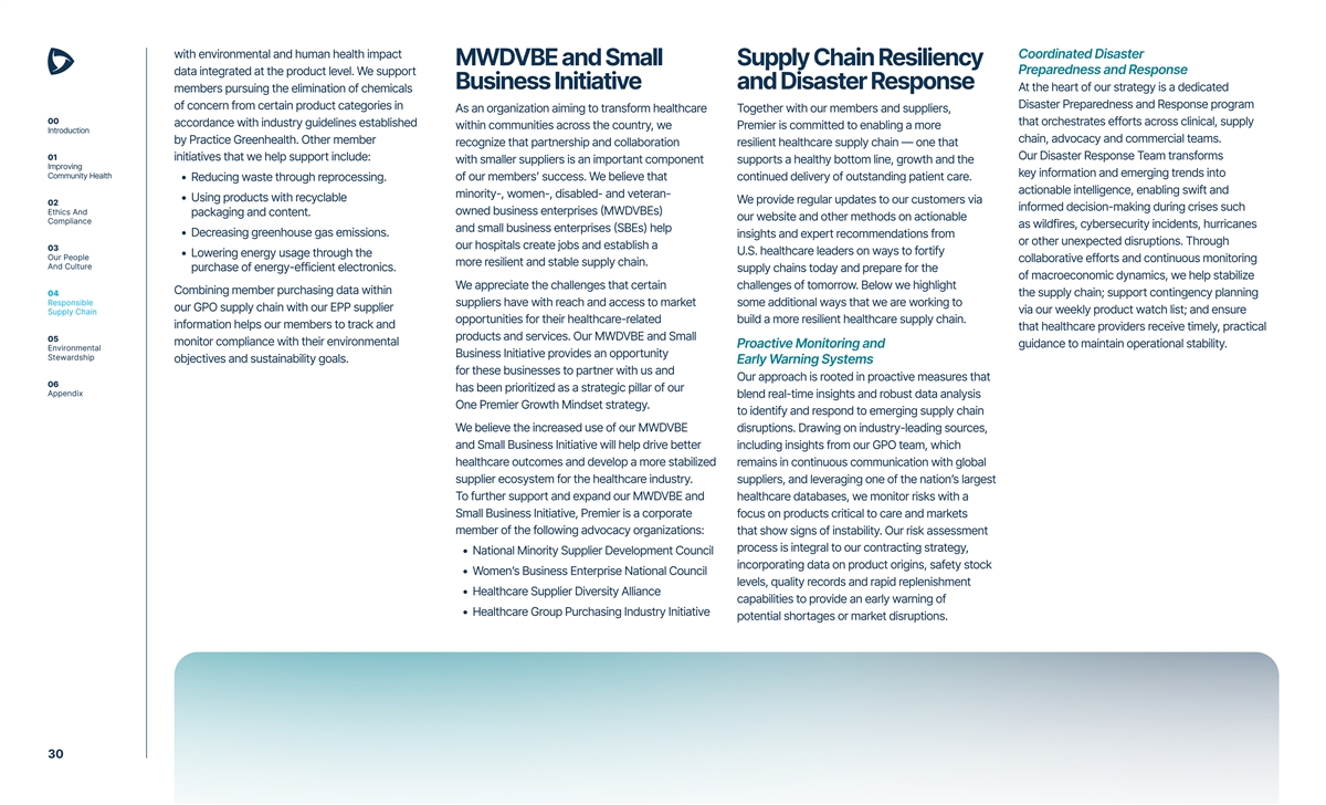 with environmental and human health impact Coordinated Disaster MWDVBE and Small Supply Chain Resiliency Preparedness and Response data integrated at the product level. We support Business Initiative and Disaster Response At the heart of our strategy is a dedicated members pursuing the elimination of chemicals Disaster Preparedness and Response program of concern from certain product categories in As an organization aiming to transform healthcare Together with our members and suppliers, 00 that orchestrates efforts across clinical, supply accordance with industry guidelines established within communities across the country, we Premier is committed to enabling a more Introduction chain, advocacy and commercial teams. by Practice Greenhealth. Other member recognize that partnership and collaboration resilient healthcare supply chain — one that Our Disaster Response Team transforms 01 initiatives that we help support include: with smaller suppliers is an important component supports a healthy bottom line, growth and the Improving key information and emerging trends into Community Health of our members’ success. We believe that continued delivery of outstanding patient care. • Reducing waste through reprocessing. actionable intelligence, enabling swift and minority-, women-, disabled- and veteran- • Using products with recyclable We provide regular updates to our customers via 02 informed decision-making during crises such Ethics And owned business enterprises (MWDVBEs) packaging and content. our website and other methods on actionable Compliance as wildfires, cybersecurity incidents, hurricanes and small business enterprises (SBEs) help • Decreasing greenhouse gas emissions. insights and expert recommendations from or other unexpected disruptions. Through our hospitals create jobs and establish a 03 U.S. healthcare leaders on ways to fortify • Lowering energy usage through the Our People collaborative efforts and continuous monitoring more resilient and stable supply chain. And Culture purchase of energy-efficient electronics. supply chains today and prepare for the of macroeconomic dynamics, we help stabilize We appreciate the challenges that certain challenges of tomorrow. Below we highlight Combining member purchasing data within 04 the supply chain; support contingency planning Responsible suppliers have with reach and access to market some additional ways that we are working to our GPO supply chain with our EPP supplier via our weekly product watch list; and ensure Supply Chain opportunities for their healthcare-related build a more resilient healthcare supply chain. information helps our members to track and that healthcare providers receive timely, practical products and services. Our MWDVBE and Small 05 monitor compliance with their environmental guidance to maintain operational stability. Proactive Monitoring and Environmental Business Initiative provides an opportunity Stewardship objectives and sustainability goals. Early Warning Systems for these businesses to partner with us and Our approach is rooted in proactive measures that 06 has been prioritized as a strategic pillar of our Appendix blend real-time insights and robust data analysis One Premier Growth Mindset strategy. to identify and respond to emerging supply chain We believe the increased use of our MWDVBE disruptions. Drawing on industry-leading sources, and Small Business Initiative will help drive better including insights from our GPO team, which healthcare outcomes and develop a more stabilized remains in continuous communication with global supplier ecosystem for the healthcare industry. suppliers, and leveraging one of the nation’s largest To further support and expand our MWDVBE and healthcare databases, we monitor risks with a Small Business Initiative, Premier is a corporate focus on products critical to care and markets member of the following advocacy organizations: that show signs of instability. Our risk assessment process is integral to our contracting strategy, • National Minority Supplier Development Council incorporating data on product origins, safety stock • Women’s Business Enterprise National Council levels, quality records and rapid replenishment • Healthcare Supplier Diversity Alliance capabilities to provide an early warning of • Healthcare Group Purchasing Industry Initiative potential shortages or market disruptions. 30