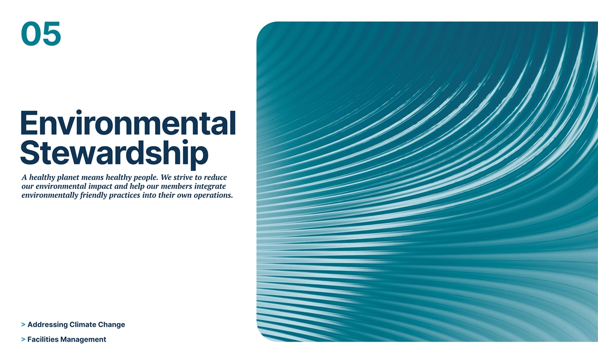 05 Environmental Stewardship A healthy planet means healthy people. We strive to reduce our environmental impact and help our members integrate environmentally friendly practices into their own operations. > Addressing Climate Change > Facilities Management