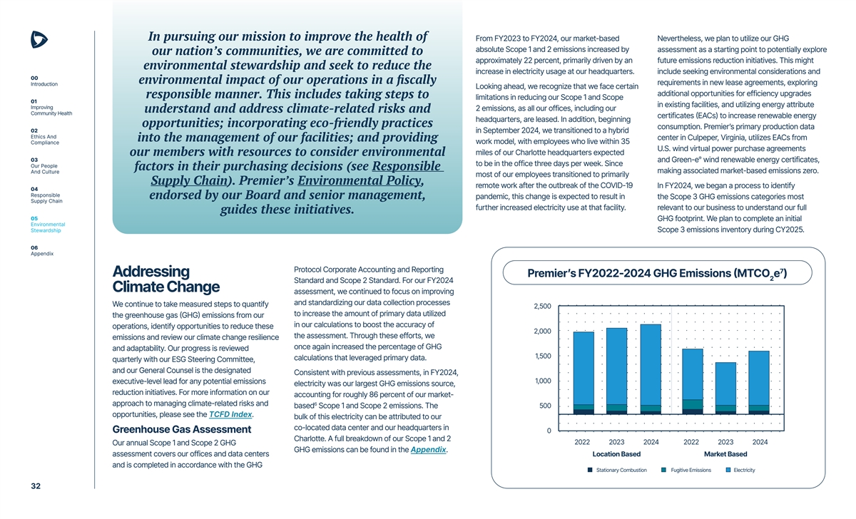 In pursuing our mission to improve the health of From FY2023 to FY2024, our market-based Nevertheless, we plan to utilize our GHG absolute Scope 1 and 2 emissions increased by assessment as a starting point to potentially explore our nation’s communities, we are committed to approximately 22 percent, primarily driven by an future emissions reduction initiatives. This might environmental stewardship and seek to reduce the increase in electricity usage at our headquarters. include seeking environmental considerations and 00 environmental impact of our operations in a fiscally requirements in new lease agreements, exploring Introduction Looking ahead, we recognize that we face certain additional opportunities for efficiency upgrades responsible manner. This includes taking steps to limitations in reducing our Scope 1 and Scope 01 in existing facilities, and utilizing energy attribute Improving 2 emissions, as all our offices, including our understand and address climate-related risks and Community Health certificates (EACs) to increase renewable energy headquarters, are leased. In addition, beginning opportunities; incorporating eco-friendly practices consumption. Premier’s primary production data 02 in September 2024, we transitioned to a hybrid Ethics And center in Culpeper, Virginia, utilizes EACs from into the management of our facilities; and providing Compliance work model, with employees who live within 35 U.S. wind virtual power purchase agreements miles of our Charlotte headquarters expected our members with resources to consider environmental ® 03 and Green-e wind renewable energy certificates, to be in the office three days per week. Since Our People factors in their purchasing decisions (see Responsible making associated market-based emissions zero. And Culture most of our employees transitioned to primarily Supply Chain). Premier’s Environmental Policy, remote work after the outbreak of the COVID-19 In FY2024, we began a process to identify 04 Responsible endorsed by our Board and senior management, pandemic, this change is expected to result in the Scope 3 GHG emissions categories most Supply Chain further increased electricity use at that facility. relevant to our business to understand our full guides these initiatives. 05 GHG footprint. We plan to complete an initial Environmental Stewardship Scope 3 emissions inventory during CY2025. 06 Appendix Protocol Corporate Accounting and Reporting 7 Addressing Premier’s FY2022-2024 GHG Emissions (MTCO e ) 2 Standard and Scope 2 Standard. For our FY2024 Climate Change assessment, we continued to focus on improving and standardizing our data collection processes We continue to take measured steps to quantify 2,500 to increase the amount of primary data utilized the greenhouse gas (GHG) emissions from our in our calculations to boost the accuracy of operations, identify opportunities to reduce these 2,000 the assessment. Through these efforts, we emissions and review our climate change resilience once again increased the percentage of GHG and adaptability. Our progress is reviewed 1,500 calculations that leveraged primary data. quarterly with our ESG Steering Committee, and our General Counsel is the designated Consistent with previous assessments, in FY2024, 1,000 executive-level lead for any potential emissions electricity was our largest GHG emissions source, reduction initiatives. For more information on our accounting for roughly 86 percent of our market- 6 approach to managing climate-related risks and based Scope 1 and Scope 2 emissions. The 500 opportunities, please see the TCFD Index. bulk of this electricity can be attributed to our co-located data center and our headquarters in Greenhouse Gas Assessment 0 Charlotte. A full breakdown of our Scope 1 and 2 2022 2023 2024 2022 2023 2024 Our annual Scope 1 and Scope 2 GHG GHG emissions can be found in the Appendix. assessment covers our offices and data centers Location Based Market Based and is completed in accordance with the GHG Stationary Combustion Fugitive Emissions Electricity 32