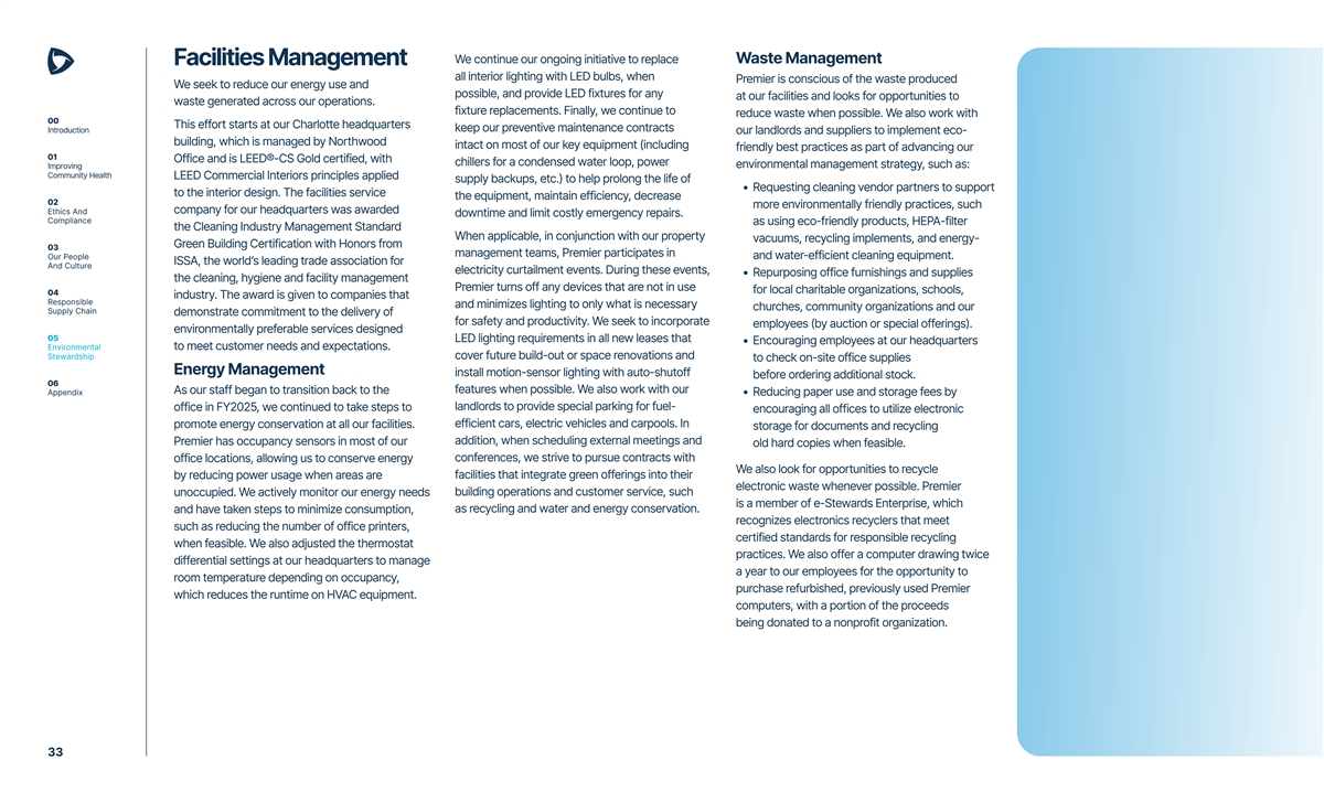 We continue our ongoing initiative to replace Waste Management Facilities Management all interior lighting with LED bulbs, when Premier is conscious of the waste produced We seek to reduce our energy use and possible, and provide LED fixtures for any at our facilities and looks for opportunities to waste generated across our operations. fixture replacements. Finally, we continue to reduce waste when possible. We also work with 00 This effort starts at our Charlotte headquarters keep our preventive maintenance contracts Introduction our landlords and suppliers to implement eco- building, which is managed by Northwood intact on most of our key equipment (including friendly best practices as part of advancing our 01 Office and is LEED®-CS Gold certified, with chillers for a condensed water loop, power environmental management strategy, such as: Improving Community Health LEED Commercial Interiors principles applied supply backups, etc.) to help prolong the life of • Requesting cleaning vendor partners to support to the interior design. The facilities service the equipment, maintain efficiency, decrease 02 more environmentally friendly practices, such Ethics And company for our headquarters was awarded downtime and limit costly emergency repairs. Compliance as using eco-friendly products, HEPA-filter the Cleaning Industry Management Standard When applicable, in conjunction with our property vacuums, recycling implements, and energy- Green Building Certification with Honors from 03 management teams, Premier participates in Our People and water-efficient cleaning equipment. ISSA, the world’s leading trade association for And Culture electricity curtailment events. During these events, • Repurposing office furnishings and supplies the cleaning, hygiene and facility management Premier turns off any devices that are not in use for local charitable organizations, schools, 04 industry. The award is given to companies that Responsible and minimizes lighting to only what is necessary churches, community organizations and our Supply Chain demonstrate commitment to the delivery of for safety and productivity. We seek to incorporate employees (by auction or special offerings). environmentally preferable services designed 05 LED lighting requirements in all new leases that • Encouraging employees at our headquarters Environmental to meet customer needs and expectations. Stewardship cover future build-out or space renovations and to check on-site office supplies Energy Management install motion-sensor lighting with auto-shutoff before ordering additional stock. 06 As our staff began to transition back to the features when possible. We also work with our Appendix • Reducing paper use and storage fees by office in FY2025, we continued to take steps to landlords to provide special parking for fuel- encouraging all offices to utilize electronic promote energy conservation at all our facilities. efficient cars, electric vehicles and carpools. In storage for documents and recycling Premier has occupancy sensors in most of our addition, when scheduling external meetings and old hard copies when feasible. office locations, allowing us to conserve energy conferences, we strive to pursue contracts with We also look for opportunities to recycle by reducing power usage when areas are facilities that integrate green offerings into their electronic waste whenever possible. Premier unoccupied. We actively monitor our energy needs building operations and customer service, such is a member of e-Stewards Enterprise, which and have taken steps to minimize consumption, as recycling and water and energy conservation. recognizes electronics recyclers that meet such as reducing the number of office printers, certified standards for responsible recycling when feasible. We also adjusted the thermostat practices. We also offer a computer drawing twice differential settings at our headquarters to manage a year to our employees for the opportunity to room temperature depending on occupancy, purchase refurbished, previously used Premier which reduces the runtime on HVAC equipment. computers, with a portion of the proceeds being donated to a nonprofit organization. 33