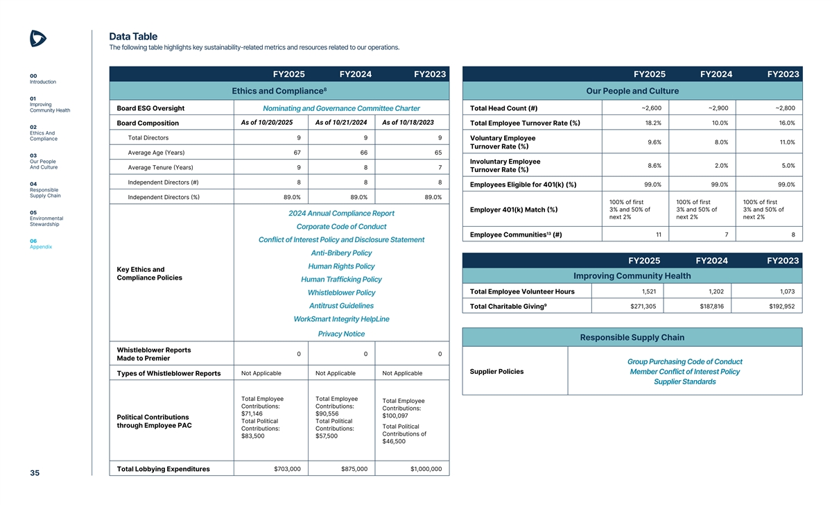Data Table The following table highlights key sustainability-related metrics and resources related to our operations. 00 FY2025 FY2024 FY2023 FY2025 FY2024 FY2023 Introduction 8 Ethics and Compliance Our People and Culture 01 Improving Board ESG Oversight Nominating and Governance Committee Charter Total Head Count (#) ~2,600 ~2,900 ~2,800 Community Health As of 10/20/2025 As of 10/21/2024 As of 10/18/2023 Board Composition Total Employee Turnover Rate (%) 18.2% 10.0% 16.0% 02 Ethics And Compliance Total Directors 9 9 9 Voluntary Employee 9.6% 8.0% 11.0% Turnover Rate (%) Average Age (Years) 67 66 65 03 Our People Involuntary Employee 8.6% 2.0% 5.0% And Culture Average Tenure (Years) 9 8 7 Turnover Rate (%) Independent Directors (#) 8 8 8 04 99.0% 99.0% 99.0% Employees Eligible for 401(k) (%) Responsible Supply Chain Independent Directors (%) 89.0% 89.0% 89.0% 100% of first 100% of first 100% of first Employer 401(k) Match (%) 3% and 50% of 3% and 50% of 3% and 50% of 05 2024 Annual Compliance Report next 2% next 2% next 2% Environmental Stewardship Corporate Code of Conduct 13 Employee Communities (#) 11 7 8 06 Conflict of Interest Policy and Disclosure Statement Appendix Anti-Bribery Policy FY2025 FY2024 FY2023 Human Rights Policy Key Ethics and Improving Community Health Compliance Policies Human Trafficking Policy Total Employee Volunteer Hours 1,521 1,202 1,073 Whistleblower Policy 9 Antitrust Guidelines Total Charitable Giving $271,305 $187,816 $192,952 WorkSmart Integrity HelpLine Privacy Notice Responsible Supply Chain Whistleblower Reports 0 0 0 Made to Premier Group Purchasing Code of Conduct Supplier Policies Member Conflict of Interest Policy Types of Whistleblower Reports Not Applicable Not Applicable Not Applicable Supplier Standards Total Employee Total Employee Total Employee Contributions: Contributions: Contributions: $71,146 $90,556 $100,097 Political Contributions Total Political Total Political through Employee PAC Total Political Contributions: Contributions: Contributions of $83,500 $57,500 $46,500 Total Lobbying Expenditures $703,000 $875,000 $1,000,000 35