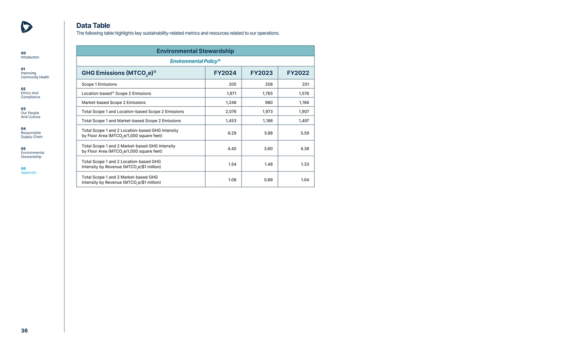Data Table The following table highlights key sustainability-related metrics and resources related to our operations. Environmental Stewardship 00 Introduction 10 Environmental Policy 01 11 Improving GHG Emissions (MTCO e) FY2024 FY2023 FY2022 2 Community Health Scope 1 Emissions 205 208 331 02 12 Ethics And Location-based Scope 2 Emissions 1,871 1,765 1,576 Compliance Market-based Scope 2 Emissions 1,248 980 1,166 03 Total Scope 1 and Location-based Scope 2 Emissions 2,076 1,973 1,907 Our People And Culture Total Scope 1 and Market-based Scope 2 Emissions 1,453 1,188 1,497 04 Total Scope 1 and 2 Location-based GHG Intensity Responsible 6.29 5.98 5.59 by Floor Area (MTCO e/1,000 square feet) Supply Chain 2 Total Scope 1 and 2 Market-based GHG Intensity 05 4.40 3.60 4.38 by Floor Area (MTCO e/1,000 square feet) Environmental 2 Stewardship Total Scope 1 and 2 Location-based GHG 1.54 1.48 1.33 Intensity by Revenue (MTCO e/$1 million) 06 2 Appendix Total Scope 1 and 2 Market-based GHG 1.08 0.89 1.04 Intensity by Revenue (MTCO e/$1 million) 2 36