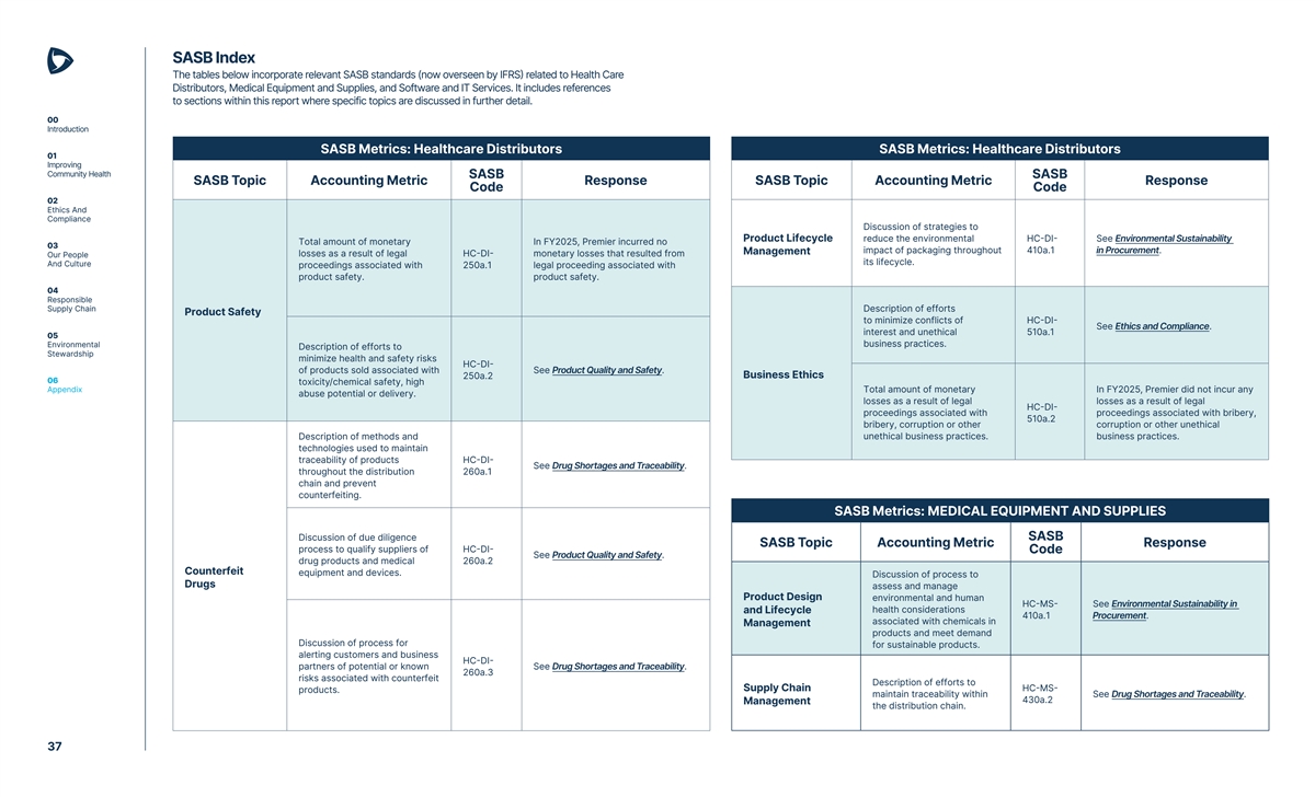 SASB Index The tables below incorporate relevant SASB standards (now overseen by IFRS) related to Health Care Distributors, Medical Equipment and Supplies, and Software and IT Services. It includes references to sections within this report where specific topics are discussed in further detail. 00 Introduction SASB Metrics: Healthcare Distributors SASB Metrics: Healthcare Distributors 01 Improving Community Health SASB SASB SASB Topic Accounting Metric Response SASB Topic Accounting Metric Response Code Code 02 Ethics And Compliance Discussion of strategies to Product Lifecycle reduce the environmental HC-DI- See Environmental Sustainability Total amount of monetary In FY2025, Premier incurred no 03 impact of packaging throughout 410a.1 in Procurement. Management losses as a result of legal HC-DI- monetary losses that resulted from Our People its lifecycle. And Culture proceedings associated with 250a.1 legal proceeding associated with product safety. product safety. 04 Responsible Supply Chain Description of efforts Product Safety to minimize conflicts of HC-DI- See Ethics and Compliance. interest and unethical 510a.1 05 Environmental business practices. Description of efforts to Stewardship minimize health and safety risks HC-DI- of products sold associated with See Product Quality and Safety. 250a.2 Business Ethics 06 toxicity/chemical safety, high Appendix Total amount of monetary In FY2025, Premier did not incur any abuse potential or delivery. losses as a result of legal losses as a result of legal HC-DI- proceedings associated with proceedings associated with bribery, 510a.2 bribery, corruption or other corruption or other unethical Description of methods and unethical business practices. business practices. technologies used to maintain traceability of products HC-DI- See Drug Shortages and Traceability. throughout the distribution 260a.1 chain and prevent counterfeiting. SASB Metrics: MEDICAL EQUIPMENT AND SUPPLIES Discussion of due diligence SASB SASB Topic Accounting Metric Response process to qualify suppliers of HC-DI- Code See Product Quality and Safety. drug products and medical 260a.2 Counterfeit equipment and devices. Discussion of process to Drugs assess and manage Product Design environmental and human HC-MS- See Environmental Sustainability in and Lifecycle health considerations 410a.1 Procurement. associated with chemicals in Management products and meet demand Discussion of process for for sustainable products. alerting customers and business HC-DI- partners of potential or known See Drug Shortages and Traceability. 260a.3 risks associated with counterfeit Description of efforts to Supply Chain HC-MS- products. maintain traceability within See Drug Shortages and Traceability. 430a.2 Management the distribution chain. 37