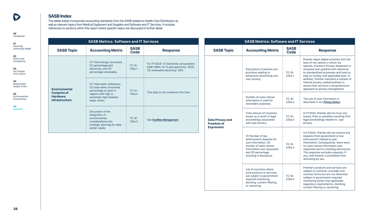 SASB Index The tables below incorporate accounting standards from the SASB related to Health Care Distributors as well as relevant topics from Medical Equipment and Supplies and Software and IT Services. It includes references to sections within this report where specific topics are discussed in further detail. 00 Introduction SASB Metrics: Software and IT Services SASB Metrics: Software and IT Services 01 Improving Community Health SASB SASB SASB Topic Accounting Metric Response SASB Topic Accounting Metric Response Code Code 02 Ethics And Premier aligns digital activities with the Compliance (1) Total energy consumed, laws of the nations in which we For FY2024: (1) Electricity consumption: (2) percentage grid TC-SI- operate. Premier’s Privacy Statement is 6,881 MWh; (2) % grid electricity: 100%, 03 electricity, and (3) 130a.1 Description of policies and reviewed and updated with reference (3) renewable electricity: 39%. Our People percentage renewable. practices relating to TC-SI- to standardized processes and tools to And Culture behavioral advertising and 220a.1 help us comply with applicable laws. In user privacy. addition, Premier maintains a number of 04 internal privacy-related policies to Responsible (1) Total water withdrawn, ensure that we have a comprehensive Supply Chain (2) total water consumed, approach to privacy management. Environmental percentage of each in TC-SI- This data is not tracked at this time. Footprint of 05 regions with high or 130a.2 Environmental Hardware extremely high baseline Number of users whose Stewardship TC-SI- The use of user information is Infrastructure water stress. information is used for 220a.2 described in our Privacy Notice. secondary purposes. 06 Appendix Discussion of the Total amount of monetary In FY2025, Premier did not incur any integration of losses as a result of legal TC-SI- losses, fines or penalties resulting from environmental TC-SI- See Facilities Management. proceedings associated 220a.3 legal proceedings related to user Data Privacy and considerations into 130a.3 with user privacy. privacy. Freedom of strategic planning for data Expression center needs. In FY2025, Premier did not receive any (1) Number of law requests from government or law enforcement requests for enforcement related to user user information, (2) information. Consequently, there were TC-SI- number of users whose no users whose information was 220a.4 information was requested, requested and no resulting disclosures. and (3) percentage This response excludes requests, if resulting in disclosure. any, that Premier is prohibited from disclosing by law. Premier’s products and services are List of countries where subject to customer oversight and core products or services contract terms but are not otherwise are subject to government- TC-SI- subject to government-required required monitoring, 220a.5 monitoring (other than applicable blocking, content filtering regulatory requirements), blocking, or censoring. content filtering or censoring. 38
