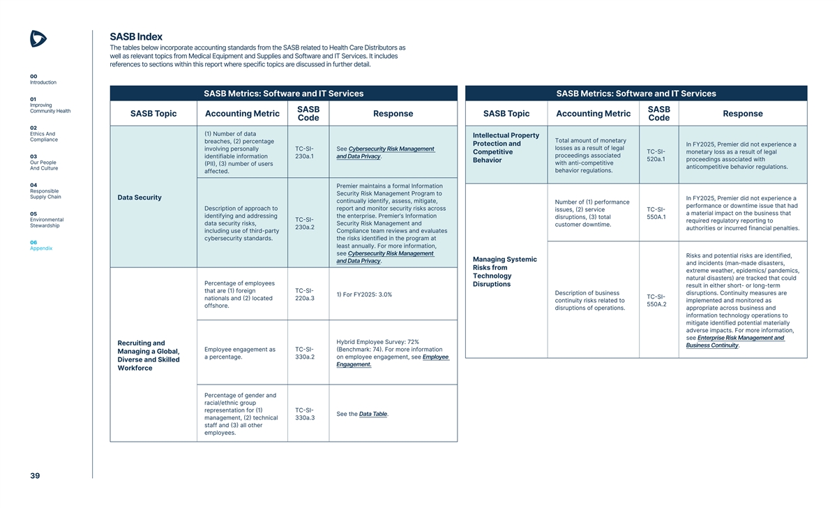 SASB Index The tables below incorporate accounting standards from the SASB related to Health Care Distributors as well as relevant topics from Medical Equipment and Supplies and Software and IT Services. It includes references to sections within this report where specific topics are discussed in further detail. 00 Introduction SASB Metrics: Software and IT Services SASB Metrics: Software and IT Services 01 Improving SASB SASB Community Health SASB Topic Accounting Metric Response SASB Topic Accounting Metric Response Code Code 02 Ethics And (1) Number of data Intellectual Property Compliance Total amount of monetary breaches, (2) percentage Protection and In FY2025, Premier did not experience a losses as a result of legal involving personally TC-SI- See Cybersecurity Risk Management TC-SI- monetary loss as a result of legal Competitive proceedings associated 03 identifiable information 230a.1 and Data Privacy. 520a.1 proceedings associated with Behavior Our People with anti-competitive (PII), (3) number of users anticompetitive behavior regulations. And Culture behavior regulations. affected. 04 Premier maintains a formal Information Responsible Security Risk Management Program to Supply Chain Data Security In FY2025, Premier did not experience a continually identify, assess, mitigate, Number of (1) performance performance or downtime issue that had Description of approach to report and monitor security risks across issues, (2) service TC-SI- a material impact on the business that 05 identifying and addressing the enterprise. Premier’s Information disruptions, (3) total 550A.1 Environmental TC-SI- required regulatory reporting to data security risks, Security Risk Management and customer downtime. Stewardship 230a.2 authorities or incurred financial penalties. including use of third-party Compliance team reviews and evaluates cybersecurity standards. the risks identified in the program at 06 least annually. For more information, Appendix see Cybersecurity Risk Management Risks and potential risks are identified, Managing Systemic and Data Privacy. and incidents (man-made disasters, Risks from extreme weather, epidemics/ pandemics, Technology natural disasters) are tracked that could Percentage of employees Disruptions result in either short- or long-term that are (1) foreign TC-SI- Description of business disruptions. Continuity measures are 1) For FY2025: 3.0% TC-SI- nationals and (2) located 220a.3 continuity risks related to implemented and monitored as 550A.2 offshore. disruptions of operations. appropriate across business and information technology operations to mitigate identified potential materially adverse impacts. For more information, see Enterprise Risk Management and Hybrid Employee Survey: 72% Recruiting and Business Continuity. Employee engagement as TC-SI- (Benchmark: 74). For more information Managing a Global, a percentage. 330a.2 on employee engagement, see Employee Diverse and Skilled Engagement. Workforce Percentage of gender and racial/ethnic group representation for (1) TC-SI- See the Data Table. management, (2) technical 330a.3 staff and (3) all other employees. 39