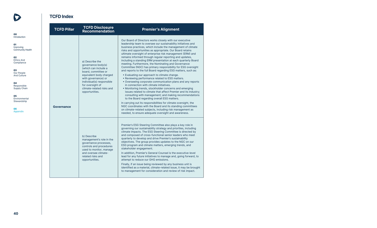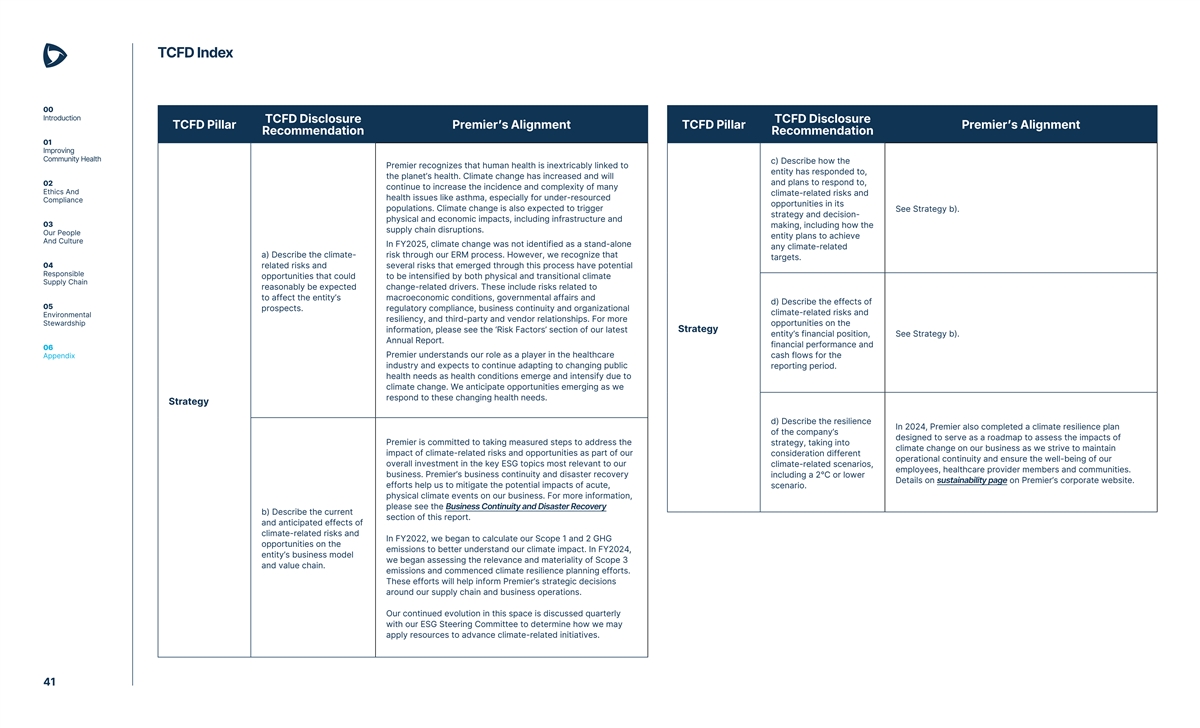 TCFD Index 00 Introduction TCFD Disclosure TCFD Disclosure TCFD Pillar Premier’s Alignment TCFD Pillar Premier’s Alignment Recommendation Recommendation 01 Improving Community Health c) Describe how the Premier recognizes that human health is inextricably linked to entity has responded to, the planet’s health. Climate change has increased and will 02 and plans to respond to, continue to increase the incidence and complexity of many Ethics And climate-related risks and health issues like asthma, especially for under-resourced Compliance opportunities in its populations. Climate change is also expected to trigger See Strategy b). strategy and decision- physical and economic impacts, including infrastructure and 03 making, including how the supply chain disruptions. Our People entity plans to achieve And Culture In FY2025, climate change was not identified as a stand-alone any climate-related a) Describe the climate- risk through our ERM process. However, we recognize that targets. 04 related risks and several risks that emerged through this process have potential Responsible opportunities that could to be intensified by both physical and transitional climate Supply Chain reasonably be expected change-related drivers. These include risks related to to affect the entity’s macroeconomic conditions, governmental affairs and d) Describe the effects of 05 prospects. regulatory compliance, business continuity and organizational climate-related risks and Environmental resiliency, and third-party and vendor relationships. For more Stewardship opportunities on the Strategy information, please see the ‘Risk Factors’ section of our latest entity’s financial position, See Strategy b). Annual Report. financial performance and 06 Appendix Premier understands our role as a player in the healthcare cash flows for the industry and expects to continue adapting to changing public reporting period. health needs as health conditions emerge and intensify due to climate change. We anticipate opportunities emerging as we respond to these changing health needs. Strategy d) Describe the resilience In 2024, Premier also completed a climate resilience plan of the company’s designed to serve as a roadmap to assess the impacts of Premier is committed to taking measured steps to address the strategy, taking into climate change on our business as we strive to maintain impact of climate-related risks and opportunities as part of our consideration different operational continuity and ensure the well-being of our overall investment in the key ESG topics most relevant to our climate-related scenarios, employees, healthcare provider members and communities. business. Premier’s business continuity and disaster recovery including a 2°C or lower Details on sustainability page on Premier’s corporate website. efforts help us to mitigate the potential impacts of acute, scenario. physical climate events on our business. For more information, please see the Business Continuity and Disaster Recovery b) Describe the current section of this report. and anticipated effects of climate-related risks and In FY2022, we began to calculate our Scope 1 and 2 GHG opportunities on the emissions to better understand our climate impact. In FY2024, entity’s business model we began assessing the relevance and materiality of Scope 3 and value chain. emissions and commenced climate resilience planning efforts. These efforts will help inform Premier’s strategic decisions around our supply chain and business operations. Our continued evolution in this space is discussed quarterly with our ESG Steering Committee to determine how we may apply resources to advance climate-related initiatives. 41