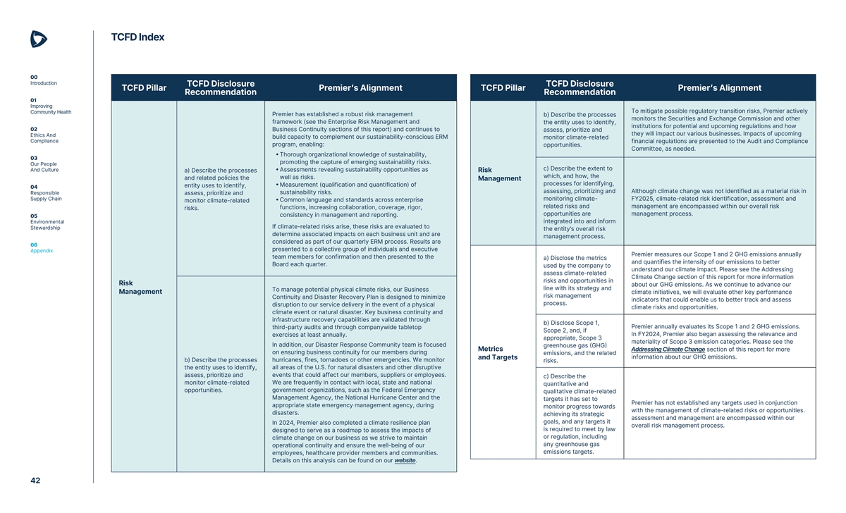 TCFD Index 00 Introduction TCFD Disclosure TCFD Disclosure TCFD Pillar Premier’s Alignment TCFD Pillar Premier’s Alignment Recommendation Recommendation 01 Improving To mitigate possible regulatory transition risks, Premier actively Community Health Premier has established a robust risk management b) Describe the processes monitors the Securities and Exchange Commission and other framework (see the Enterprise Risk Management and the entity uses to identify, institutions for potential and upcoming regulations and how 02 Business Continuity sections of this report) and continues to assess, prioritize and they will impact our various businesses. Impacts of upcoming Ethics And build capacity to complement our sustainability-conscious ERM monitor climate-related Compliance financial regulations are presented to the Audit and Compliance program, enabling: opportunities. Committee, as needed. • Thorough organizational knowledge of sustainability, 03 promoting the capture of emerging sustainability risks. Our People c) Describe the extent to And Culture • Assessments revealing sustainability opportunities as a) Describe the processes Risk which, and how, the well as risks. and related policies the Management processes for identifying, • Measurement (qualification and quantification) of entity uses to identify, 04 assessing, prioritizing and Although climate change was not identified as a material risk in Responsible sustainability risks. assess, prioritize and Supply Chain monitoring climate- FY2025, climate-related risk identification, assessment and • Common language and standards across enterprise monitor climate-related related risks and management are encompassed within our overall risk functions, increasing collaboration, coverage, rigor, risks. opportunities are management process. consistency in management and reporting. 05 integrated into and inform Environmental If climate-related risks arise, these risks are evaluated to Stewardship the entity’s overall risk determine associated impacts on each business unit and are management process. considered as part of our quarterly ERM process. Results are 06 presented to a collective group of individuals and executive Appendix Premier measures our Scope 1 and 2 GHG emissions annually team members for confirmation and then presented to the a) Disclose the metrics and quantifies the intensity of our emissions to better Board each quarter. used by the company to understand our climate impact. Please see the Addressing assess climate-related Climate Change section of this report for more information risks and opportunities in Risk about our GHG emissions. As we continue to advance our line with its strategy and To manage potential physical climate risks, our Business Management climate initiatives, we will evaluate other key performance risk management Continuity and Disaster Recovery Plan is designed to minimize indicators that could enable us to better track and assess process. disruption to our service delivery in the event of a physical climate risks and opportunities. climate event or natural disaster. Key business continuity and infrastructure recovery capabilities are validated through b) Disclose Scope 1, Premier annually evaluates its Scope 1 and 2 GHG emissions. third-party audits and through companywide tabletop Scope 2, and, if In FY2024, Premier also began assessing the relevance and exercises at least annually. appropriate, Scope 3 materiality of Scope 3 emission categories. Please see the In addition, our Disaster Response Community team is focused greenhouse gas (GHG) Metrics Addressing Climate Change section of this report for more on ensuring business continuity for our members during emissions, and the related information about our GHG emissions. and Targets b) Describe the processes hurricanes, fires, tornadoes or other emergencies. We monitor risks. the entity uses to identify, all areas of the U.S. for natural disasters and other disruptive assess, prioritize and events that could affect our members, suppliers or employees. c) Describe the monitor climate-related We are frequently in contact with local, state and national quantitative and opportunities. government organizations, such as the Federal Emergency qualitative climate-related Management Agency, the National Hurricane Center and the targets it has set to Premier has not established any targets used in conjunction appropriate state emergency management agency, during monitor progress towards with the management of climate-related risks or opportunities. disasters. achieving its strategic assessment and management are encompassed within our goals, and any targets it In 2024, Premier also completed a climate resilience plan overall risk management process. is required to meet by law designed to serve as a roadmap to assess the impacts of or regulation, including climate change on our business as we strive to maintain any greenhouse gas operational continuity and ensure the well-being of our emissions targets. employees, healthcare provider members and communities. Details on this analysis can be found on our website. 42