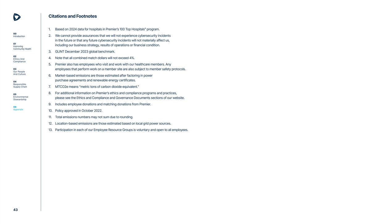 Citations and Footnotes ® 1. Based on 2024 data for hospitals in Premier’s 100 Top Hospitals program. 00 Introduction 2. We cannot provide assurances that we will not experience cybersecurity incidents in the future or that any future cybersecurity incidents will not materially affect us, 01 including our business strategy, results of operations or financial condition. Improving Community Health 3. GLINT December 2023 global benchmark. 02 4. Note that all combined match dollars will not exceed 4%. Ethics And Compliance 5. Premier also has employees who visit and work with our healthcare members. Any 03 employees that perform work on a member site are also subject to member safety protocols. Our People And Culture 6. Market-based emissions are those estimated after factoring in power purchase agreements and renewable energy certificates. 04 Responsible Supply Chain 7. MTCO2e means “metric tons of carbon dioxide equivalent.” 8. For additional information on Premier’s ethics and compliance programs and practices, 05 Environmental please see the Ethics and Compliance and Governance Documents sections of our website. Stewardship 9. Includes employee donations and matching donations from Premier. 06 Appendix 10. Policy approved in October 2022. 11. Total emissions numbers may not sum due to rounding. 12. Location-based emissions are those estimated based on local grid power sources. 13. Participation in each of our Employee Resource Groups is voluntary and open to all employees. 43